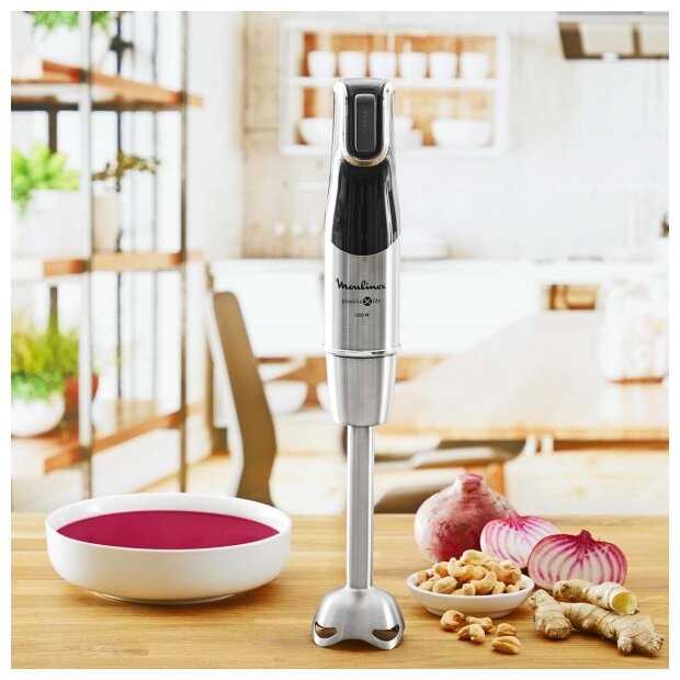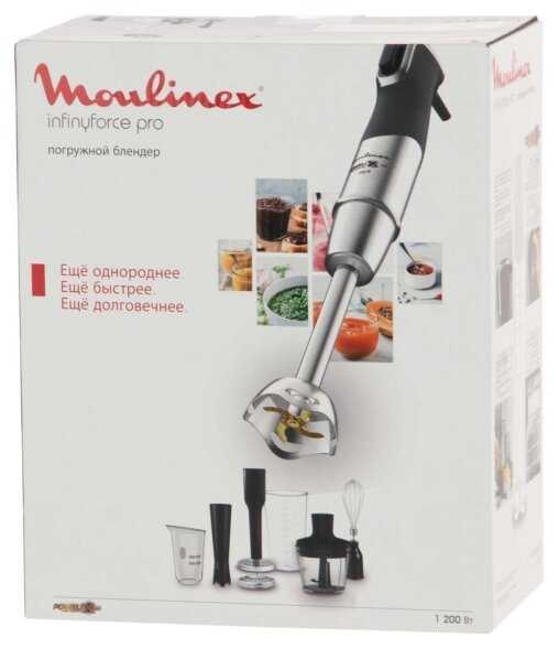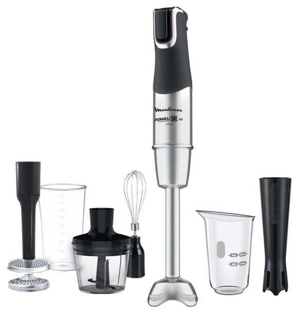 - + Moulinex InfinyForce Pro DD95KD10 погружной универсальный блендер мощный мотор 1200 ват, регулировка скорости на кнопке одним нажатием в процессе использования очень удобно, в комплекте есть насадка для приготовления пюре которая облегчает в разы процесс приготовления, насадка для приготовления соусов в домашних условиях, венчик для взбивания и насадка измельчитель с чашей 0,5 литра. Двигатель блендера работает тихо это очень удобно, когда используете прибор рано утром или поздно вечером никому не мешает. Сделано все качественно материал блендера и насадок нержавеющая сталь и пластик ручка с прорезиненными вставками. Блендер облегчает и ускорят процессы по приготовлению блюд.