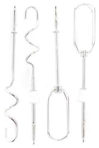 - Две пары насадок (венчики и крюки) из прочной стали, легко снимаются без кнопок.