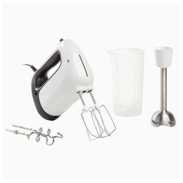 - + Миксер мощный, справляется и с взбиванием белков, и с замесом теста, и даже может работать как погружной блендер благодаря комплектным насадкам. Есть пять скоростей и турборежим, что позволяет подобрать оптимальный режим для любого блюда. Удобно лежит в руке, даже при длительной работе кисть не устаёт. Корпус прочный, сборка качественная, насадки меняются легко одним нажатием кнопки. В комплекте есть венчики, крюки для теста, блендерная насадка и мерный стакан — всё продумано для разных задач. Работает достаточно тихо для своей мощности, что приятно при длительном использовании