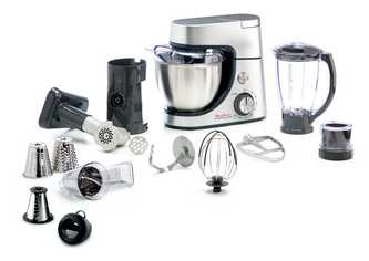 - 10 насадок в комплекте: мясорубка, блендер, измельчитель, терка-шинковка с кубикорезкой, крюк, венчик.