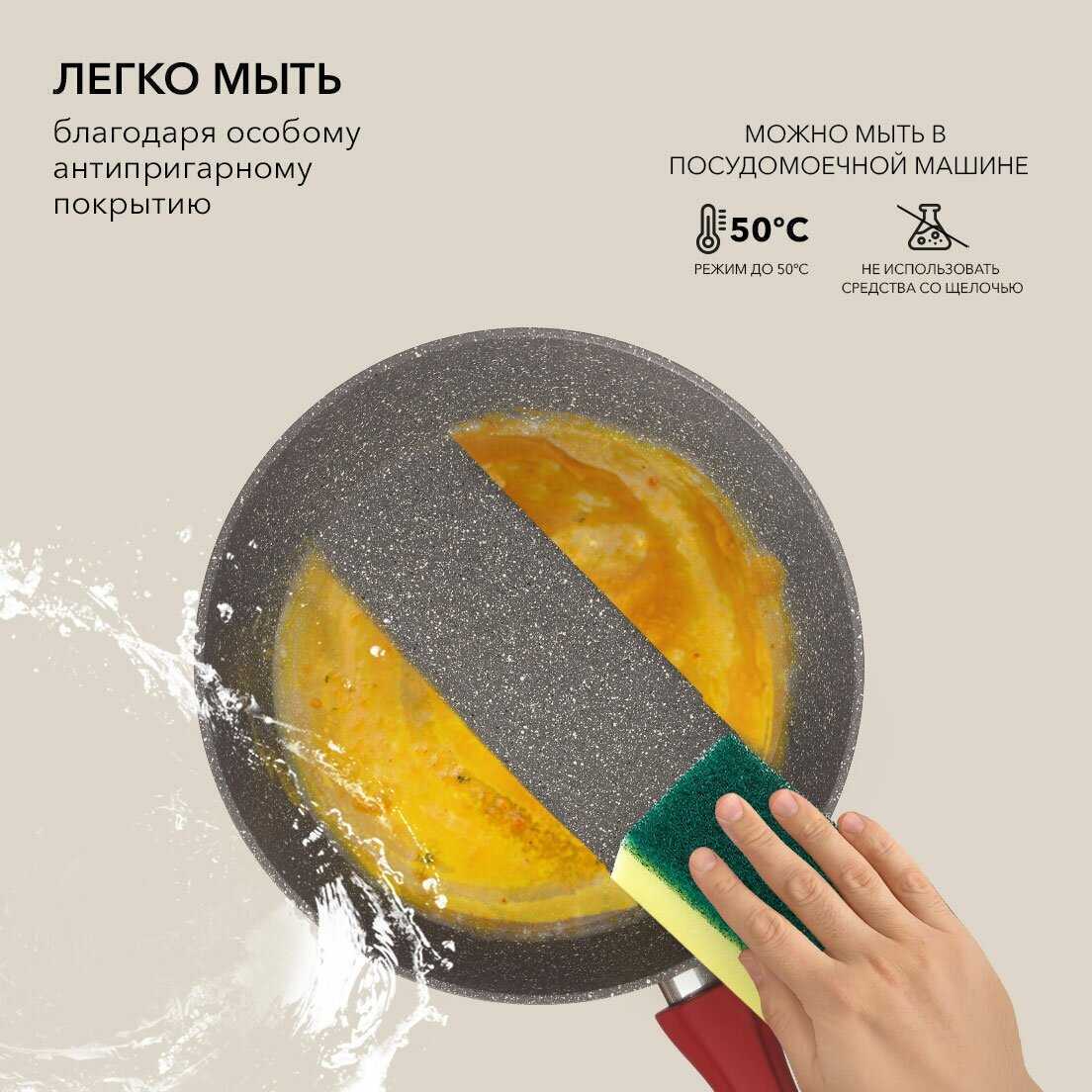 - Отсутствие щелей в соединении ручки с корпусом упрощает удаление жира и нагара под проточной водой без абразивных средств.