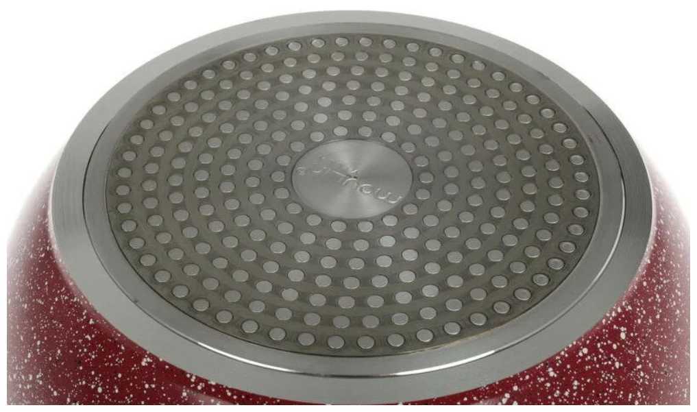 - Плоская поверхность обеспечивает полный контакт с конфоркой, ускоряя нагрев и предотвращая скатывание сковороды.