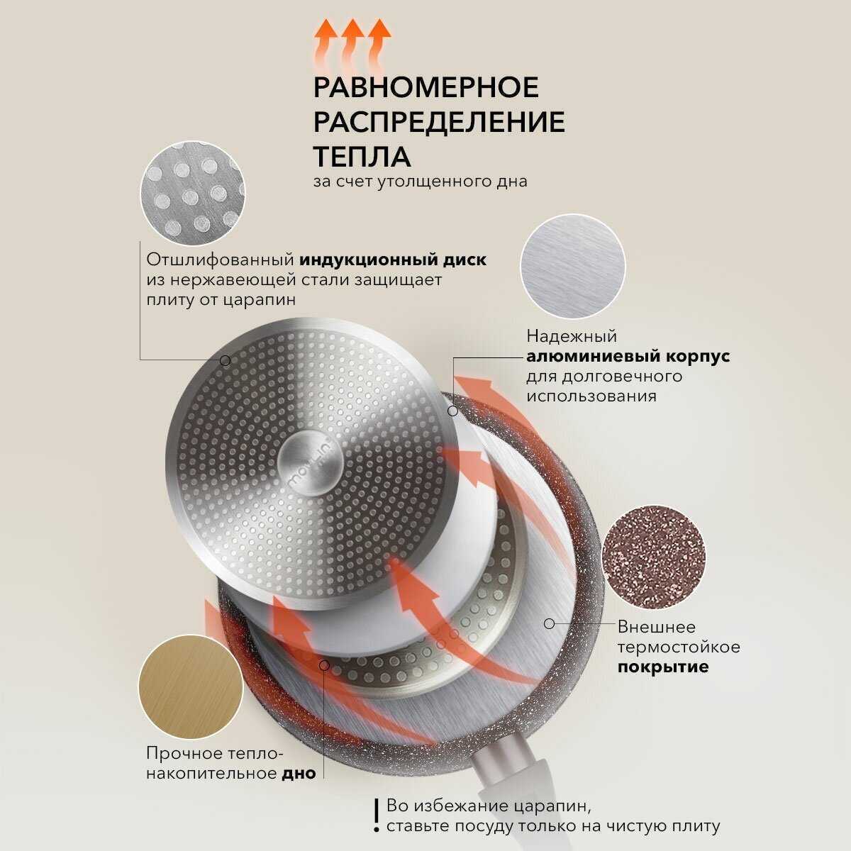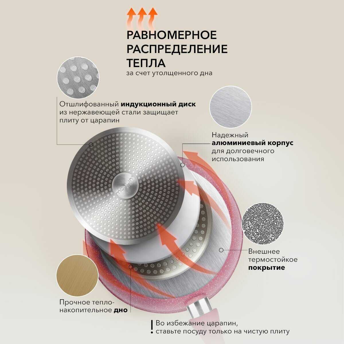 Целевая аудитория и конкуренты Продукт оптимален для бюджетно-ориентированных пользователей, готовых к замене каждые 1-2 года. В сравнении с Tefal, отмечается лучшее соотношение цены и начального качества покрытия ("первые месяцы работает безупречно"), но уступает в долговечности ("Tefal служила полтора года без нареканий"). Для мощных индукционных плит рекомендованы модели с усиленным дном толщиной от 4 мм – они меньше деформируются, хотя и дороже базовой линейки.