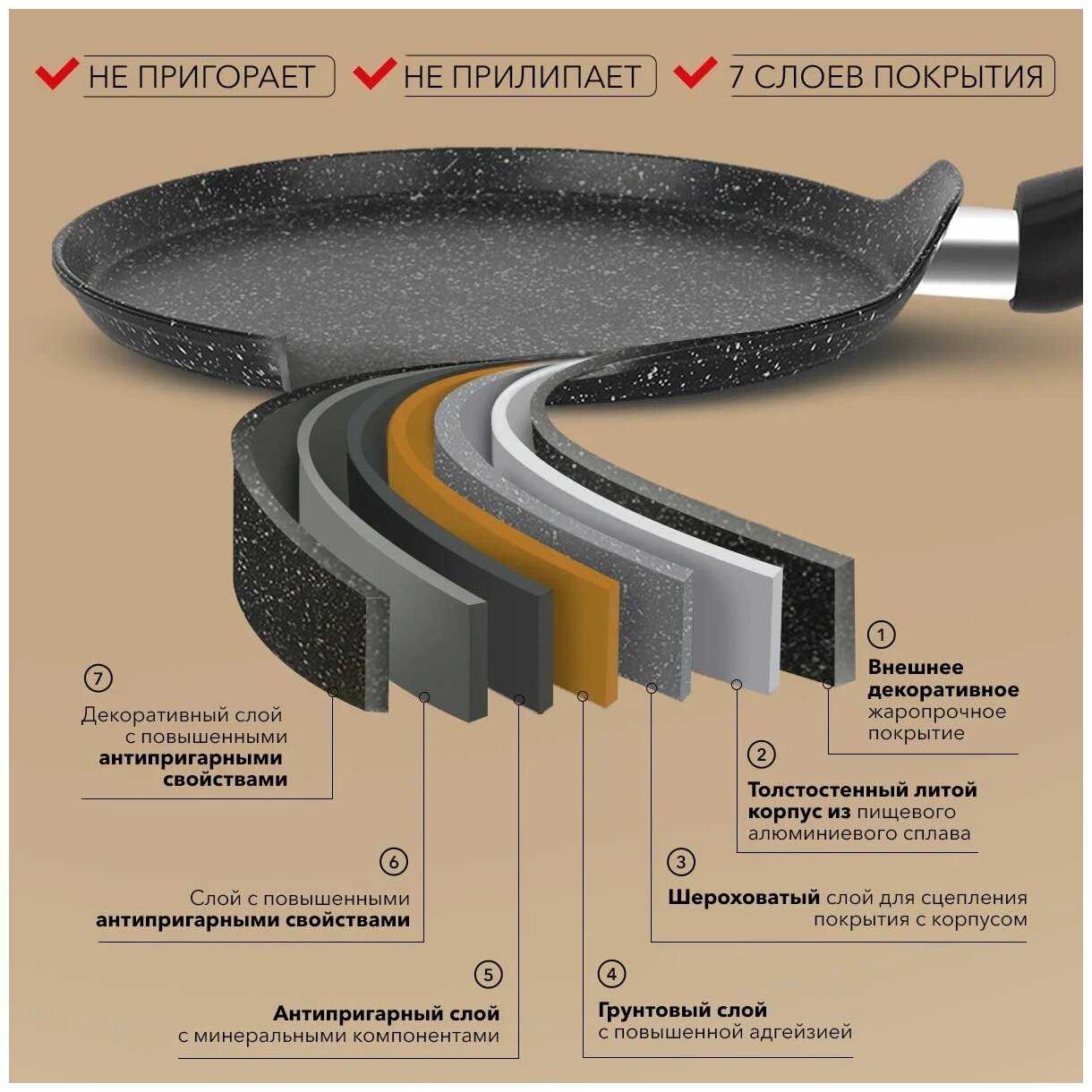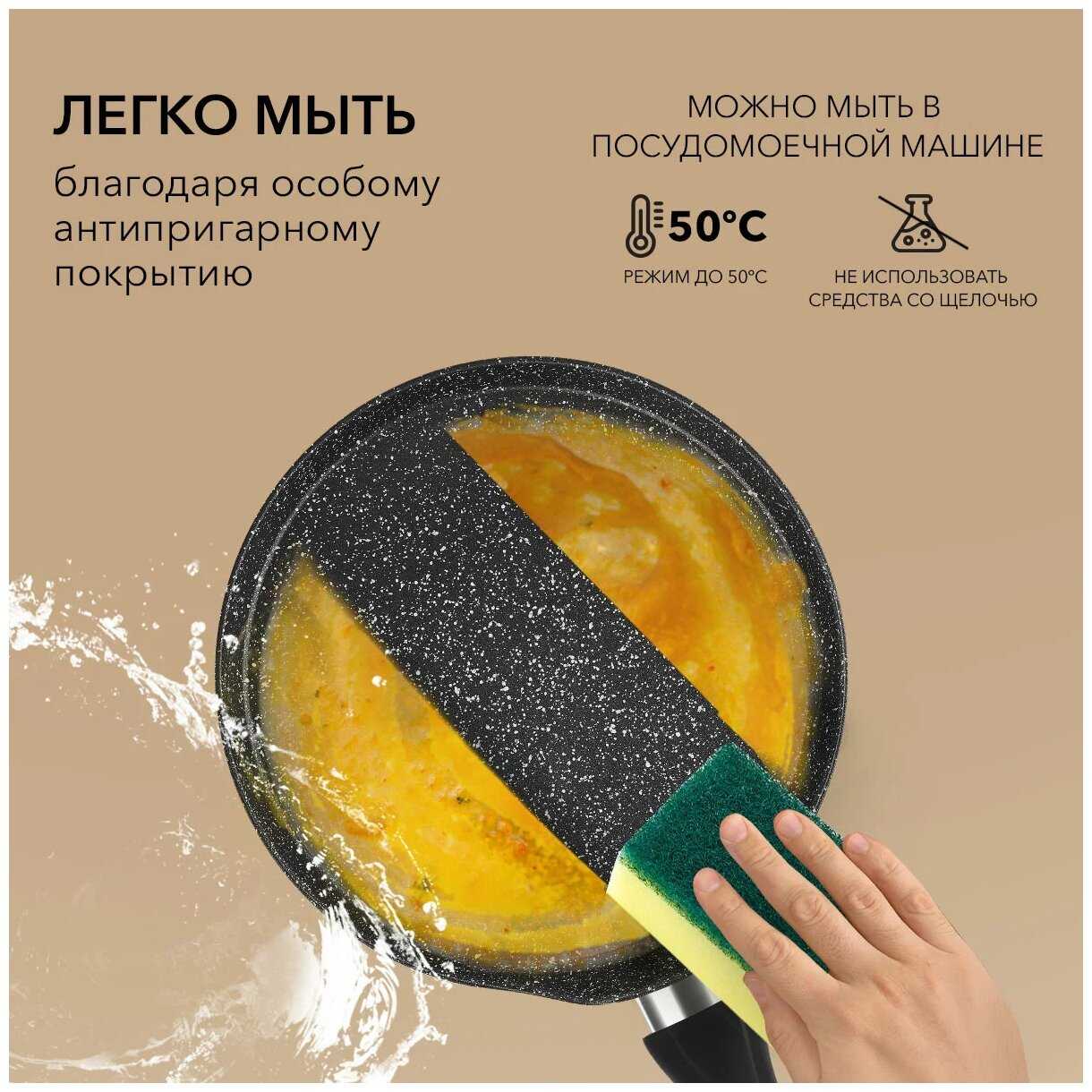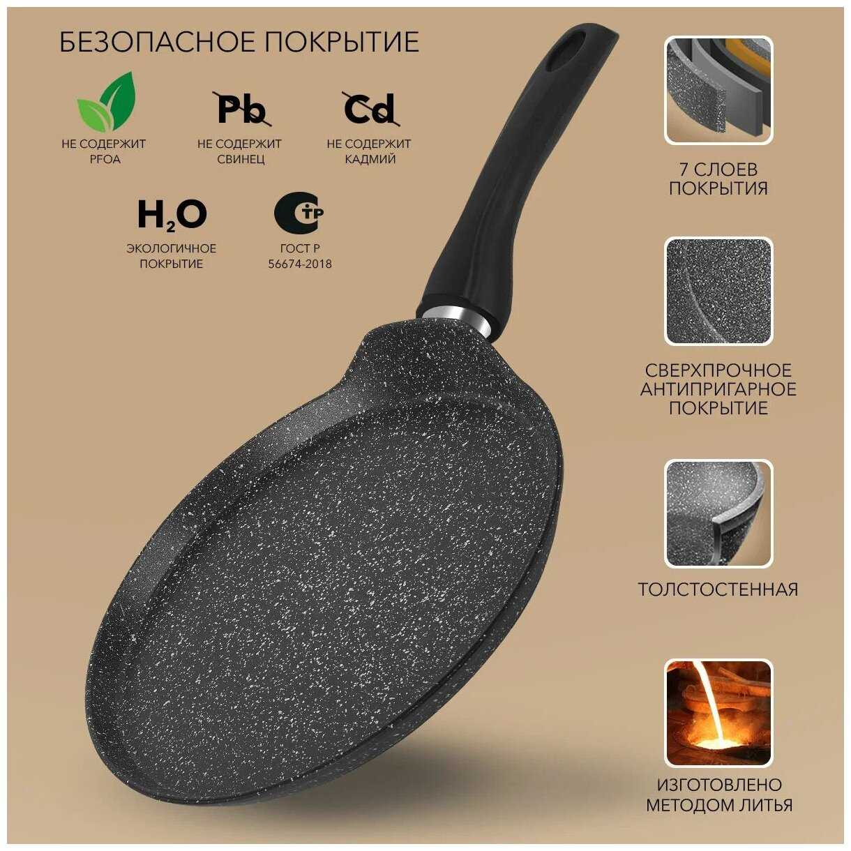 Пользователи особенно хвалят её для блинов, оладий и яичницы — продукты не прилипают даже с минимальным количеством масла. Высокие борта (до 6.5 см) позволяют тушить овощи, готовить плов и жаркое. Толстое дно обеспечивает равномерную румяную корочку при жарке картофеля и стейков. -