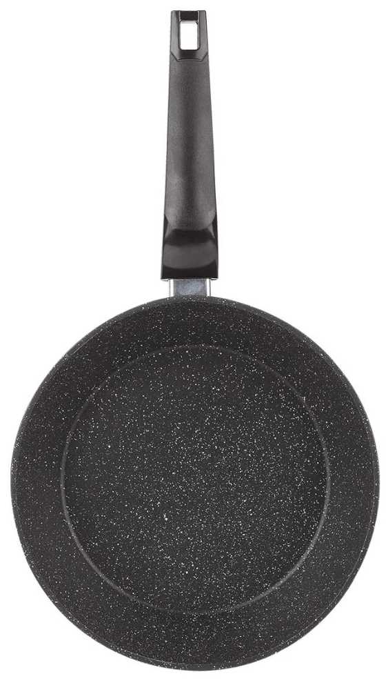 - + Отличная сковорода, ничего не пригорает! Толстая семислойная! Ручка не съемная, это тоже плюс, так как со временем у сковородок со съемными ручками они начинают отваливаться)). А у этой все супер. Высота стенок отличная, как раз то что нужно, чтобы ничего не разбрызгивалось и все помещалось при тушении.
