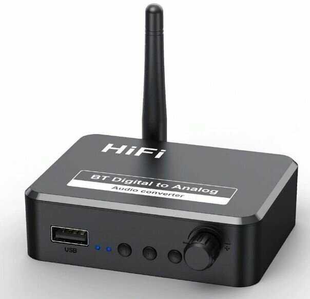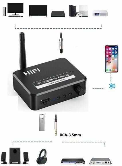 После долгих манипуляций, внимательно , ещё раз ,перечитал в интернете, перевод инструкции, и до меня дошло: для ПРИЕМА цифровых сигналов звука в устройстве предусмотрено несколько входов --юсби, оптический и блютуз. На выход работает один канал --аналоговый, проводной. Он подключен к гнезду " тюльпан и 3,5". К этому выходу подключил другой прибор--преобразоваталь в блютуз. Теперь ночами слушаю телевизор на беспроводные наушники!