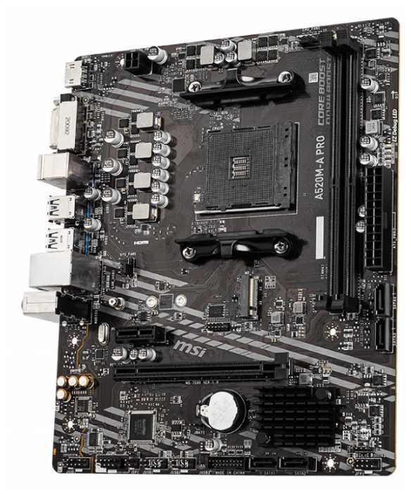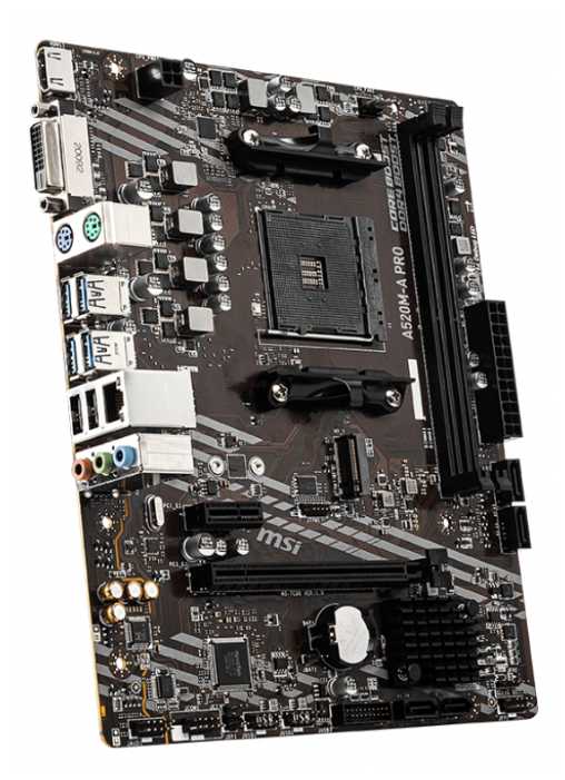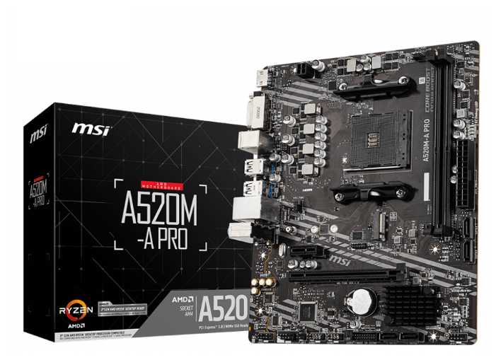 Материнская плата MSI A520M-A PRO — отличный выбор для сборки бюджетного ПК на базе процессоров AMD Ryzen. Она предлагает хорошую производительность и стабильность. Плата компактного формата Micro-ATX, что делает ее идеальной для систем с ограниченным пространством.