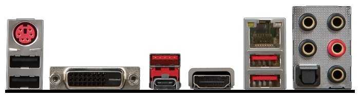 Разъемы на задней панели : | 2 x USB 2.0 Type-A, 3 x USB 3.2 Gen1 Type-A, DVI, HDMI, LAN RJ-45, PS/2 (клавиатура/мышь), USB 3.2 Gen1 Type-C, выход S/PDIF оптический |
