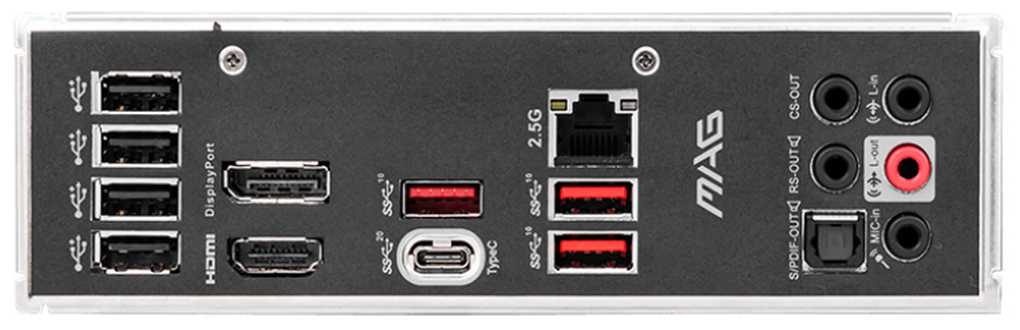| Разъемы на задней панели : | 2 x USB 3.2 Gen1 Type-A, 3 x USB 3.2 Gen1 Type-A, 4 x USB 2.0 Type-A, DisplayPort, HDMI, LAN RJ-45, USB 3.2 Gen2 Type-C, USB 3.2 Gen2x2 Type-C, выход S/PDIF оптический |