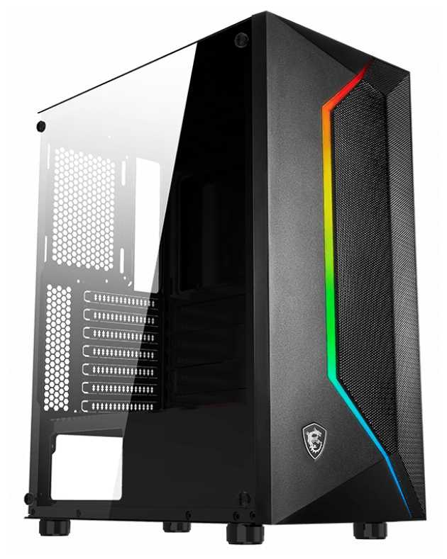 Хороший вместительный корпус формата Standard-Atx от MSI. Выглядит солидно, есть подсветка, нижнее расположение для б.п. и за счет длинных "ножек" корпус немного приподнят, что дает + к охлаждению. Собран из нормального металла, что лично меня радует, ну а кулеры можно и докупить.
