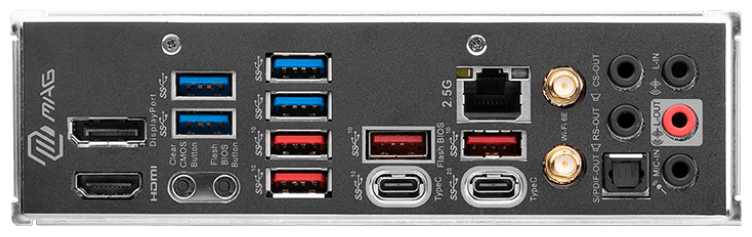 | Разъемы на задней панели : | 2 x SMA (для антенны Wi-Fi), 2 x USB 2.0 Type-A, 2 x USB 3.2 Gen1 Type-A, 4 x USB 3.2 Gen1 Type-A, DisplayPort, HDMI, LAN RJ-45, SMA (для антенны Wi-Fi), USB 3.2 Gen2 Type-C, USB 3.2 Gen2x2 Type-C, выход S/PDIF коаксиальный, выход S/PDIF оптический |