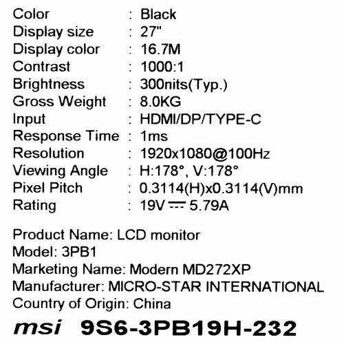 Характеристи MSI MODERN MD272XP