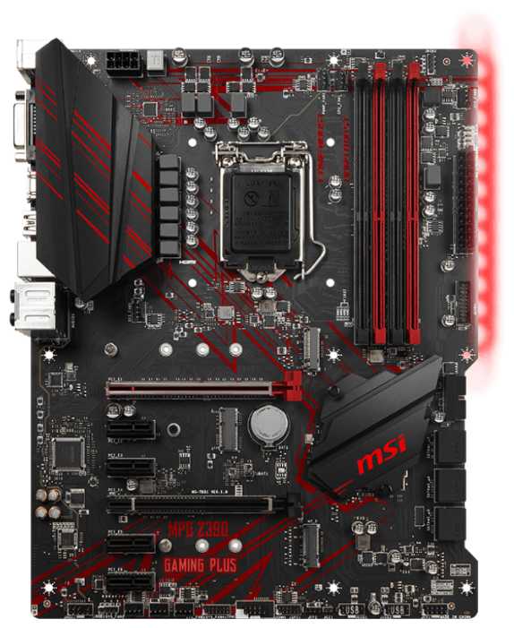 MSI Z390 MPG GAMING PLUS Пока является самой доступной моделью компании на чипсете Z390 среди ATX плат из игровых линеек. Оформление новинки понравится любителям корпусов со стеклом, от подсветки пришлось отказаться, однако присутствует пара колодок под светодиодные ленты, при покупке советую брать от компании MSI, т.к MSI сделали связь между своими комплектующими, подключив светодиодную ленту (MSI), к материнской плате (MSI), появляется возможность синхронизировать подсветку с помощью бесплатного софта от MSI, на будущее скажу, что если материнская плата MSI с подсветкой, то светодиодную ленту можно настроить, что-бы она светилась или переливалась с материнской платой. Дисковая система представлена 2-умя интерфейсами М2 Socket 3 и 6-ю портами SATA 3.0, Четыре слота стандартного разъема DDR4 поддерживают частоту оперативки до 4400 МГц, а максимальный её обьем составляет да 64 гб. Система охлаждение состоит из пару алюминиевых радиаторов на чипсете и элементах подсистемы питания процессора, их эффективность находится на хорошем уровне, по этому по поводу перегрева я не волновался. Для организации графической подсистемы есть 2 слота