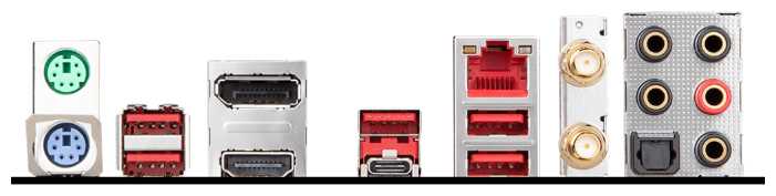 Разъемы на задней панели : | 2 x SMA (для антенны Wi-Fi), 4 x USB 3.2 Gen1 Type-A, DisplayPort, HDMI, PS/2 (клавиатура), PS/2 (мышь), SMA (для антенны Wi-Fi), USB 3.2 Gen2 Type-A, USB 3.2 Gen2 Type-C, выход S/PDIF оптический |