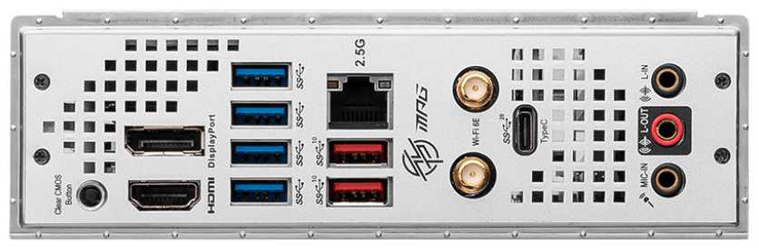 | Разъемы на задней панели : | 2 x SMA (для антенны Wi-Fi), 2 x USB 3.2 Gen2 Type-A, 4 x USB 3.2 Gen1 Type-A, DisplayPort, HDMI, LAN RJ-45, SMA (для антенны Wi-Fi), USB 3.2 Gen1 Type-A, USB 3.2 Gen1 Type-C, USB 3.2 Gen2 Type-A, USB 3.2 Gen2x2 Type-C |