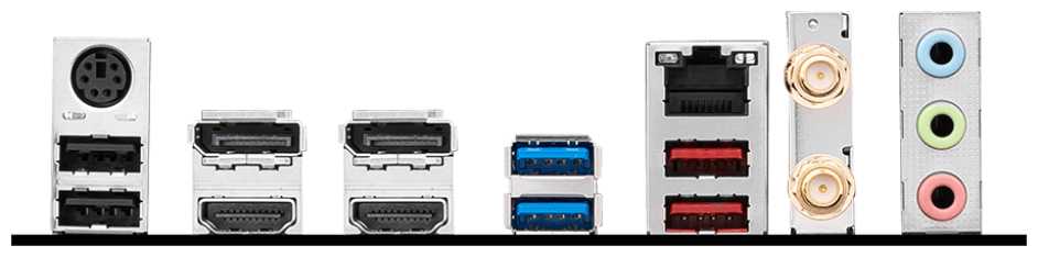 | Разъемы на задней панели : | 2 x DisplayPort, 2 x HDMI, 2 x SMA (для антенны Wi-Fi), 2 x USB 2.0 Type-A, 2 x USB 3.2 Gen1 Type-A, 2 x USB 3.2 Gen2 Type-A, DisplayPort, HDMI, LAN RJ-45, PS/2 (клавиатура/мышь), SMA (для антенны Wi-Fi) |