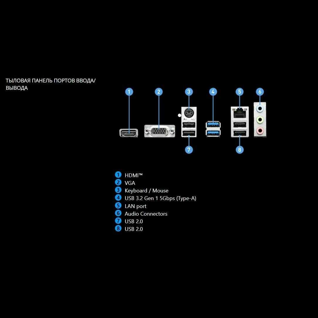 Разъемы на задней панели : | 2 x USB 3.2 Gen1 Type-A, 4 x USB 2.0 Type-A, 4 x USB 3.2 Gen1 Type-A, DisplayPort, HDMI, LAN RJ-45, VGA |