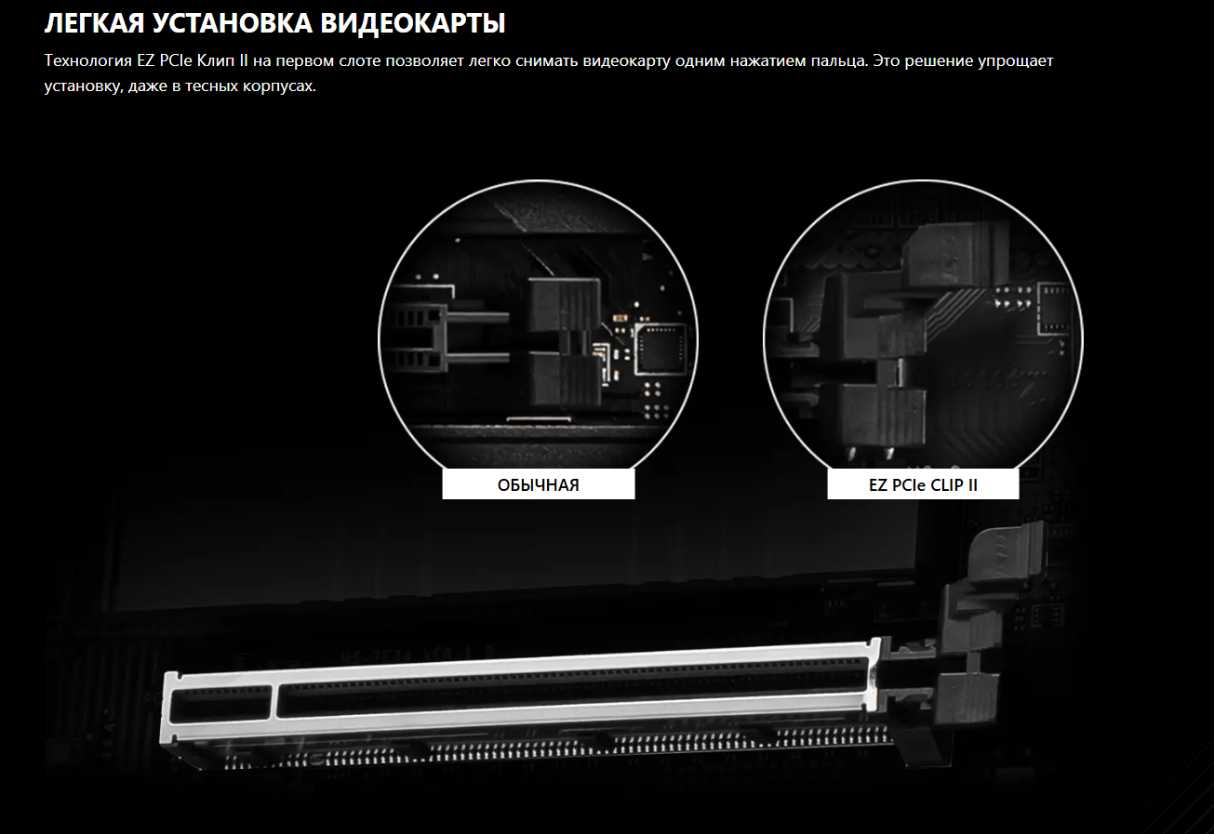 Слоты PCI-E подробно : | 2 x PCI-E 4.0 x16, 2 x PCI-E 4.0 x4, PCI-E 3.0 x1, PCI-E 3.0 x16, PCI-E 5.0 x16 |