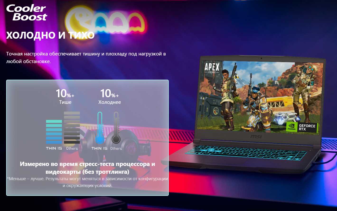 - - Ноутбук отказывается нормально работать с Windows 10. При активном использовании ноутбук сам включал Cooler boost, снижая производительность. Проблемы с драйверами есть, но всё решается переходом на Windows 11. Из коробки у ноутбука была проблема со звуком. Не его отсутствие, а качество. С прошлым msi gf63 такой проблемы не было, теперь это решается установкой Nahimic и выключением там объёмного звука, ну это уже кому как нравится