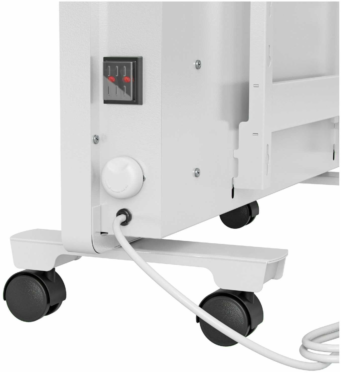 - + Этот конвектор был удачно в наличии и выбран из-за мощности, довольно быстро нагревается, заявленное комнатное пространство согревает хорошо. Все конструкции крепкие, при этом сам конвектор нетяжелый. На узкой боковой стороне есть два тумблера под резиновой защитной заглушкой (один включенный на половину мощности, два на полную мощность) и регулятор со стрелкой, если его докручивать до конца, даже с одним включенным тумблером конвектор будет автоматически отключаться во избежание перегрева. Конвектор легко крепится на двух металлических опорных горизонтальных ножках (в наборе есть винты), на которые можно дополнительно прикрепить ролики для легкого передвижения, ролики тоже в наборе, ставить необязательно. Конвектор на опорах довольно устойчив. Также в наборе есть металлическое крепление (с пластиковыми дюбелями и саморезами) для установки конвектора на стену (при желании, будет работать как электрическая батарея).