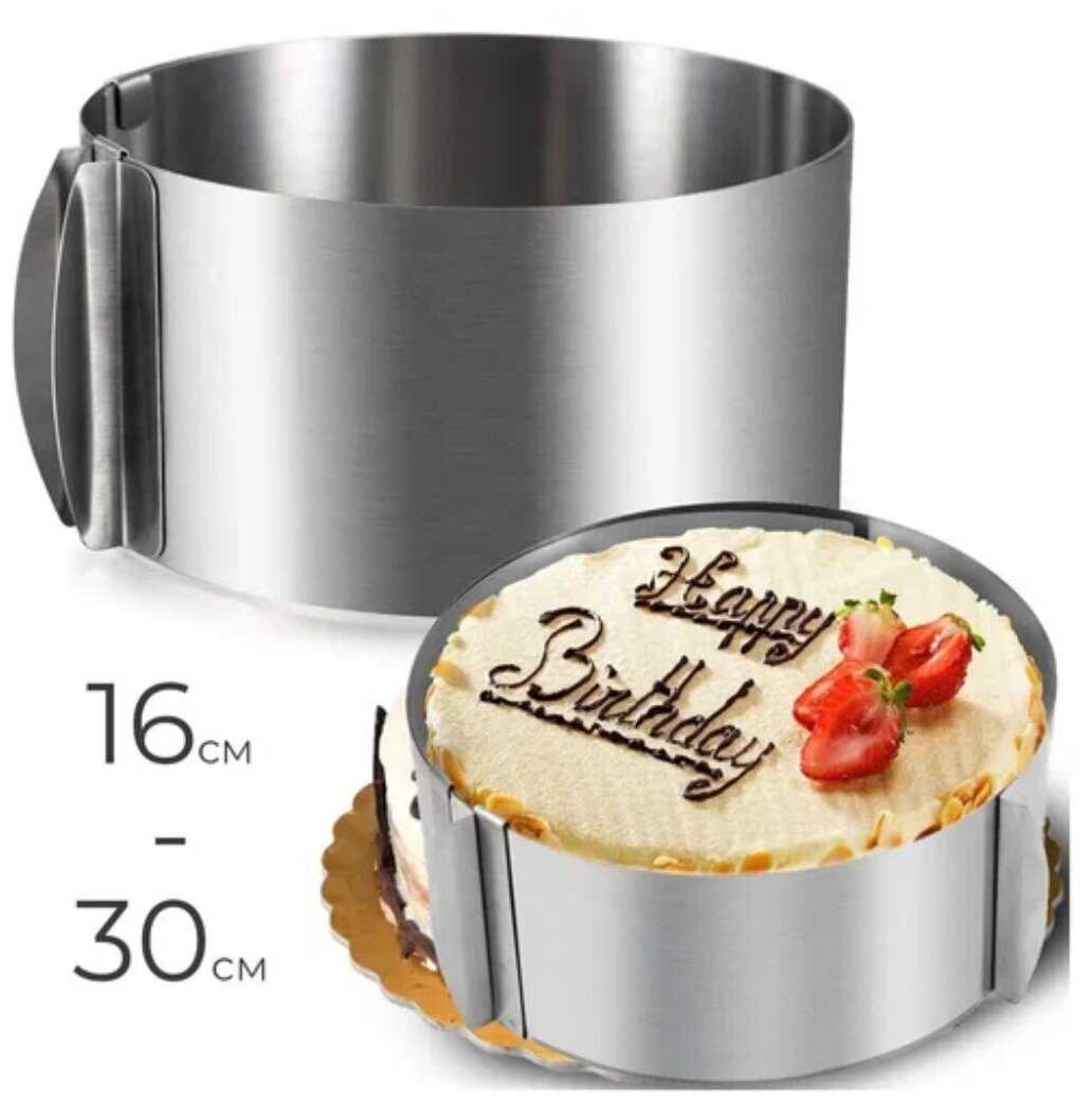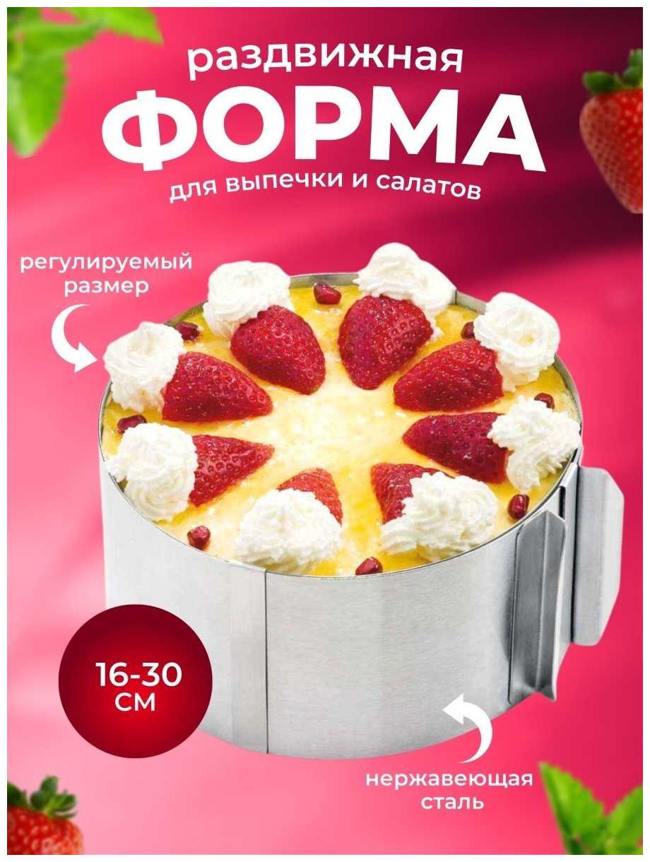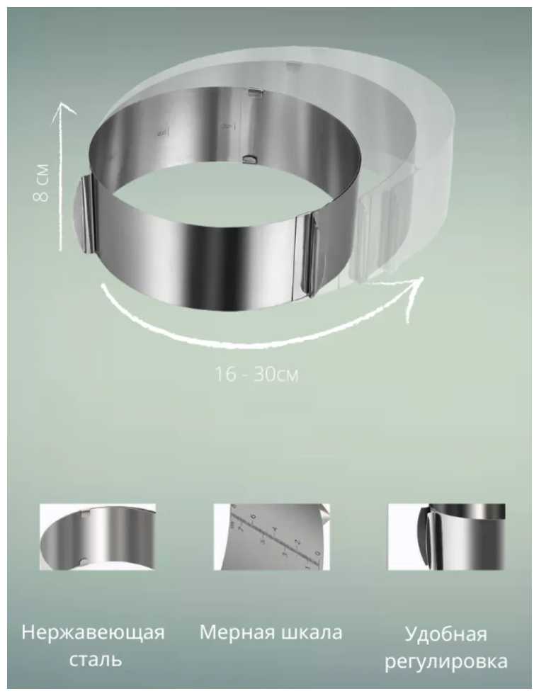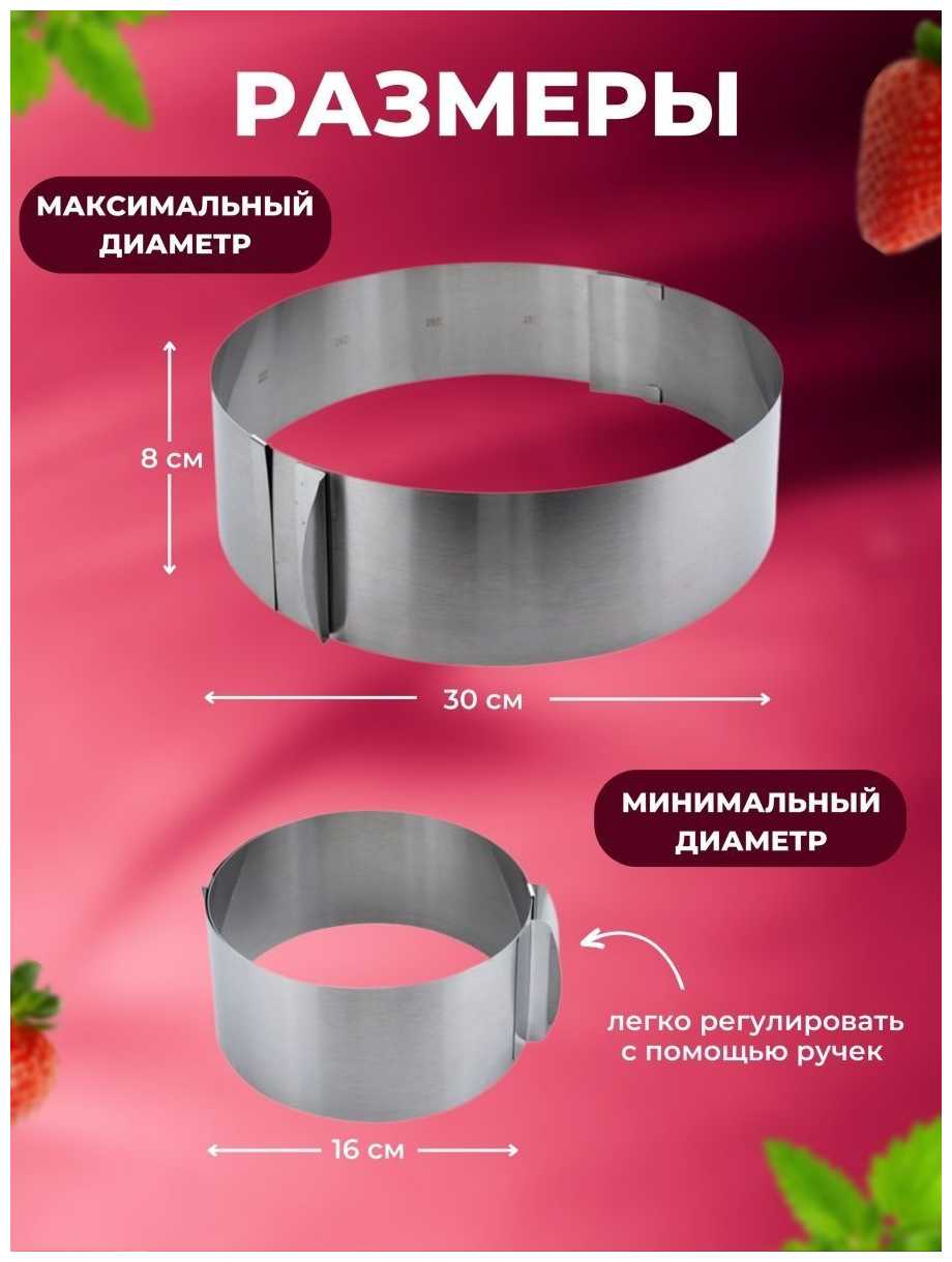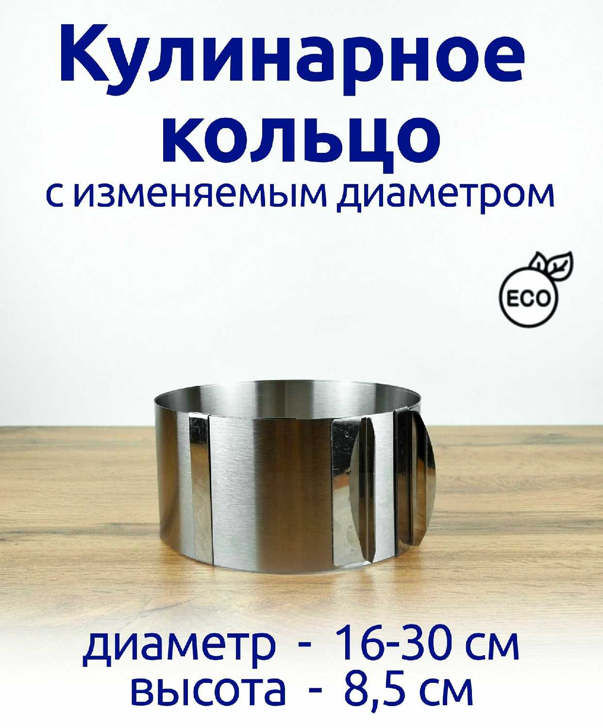 - Плавная настройка от 16 до 30 см позволяет заменить несколько форм одним кольцом, адаптируясь под любой объем теста или размер салата.