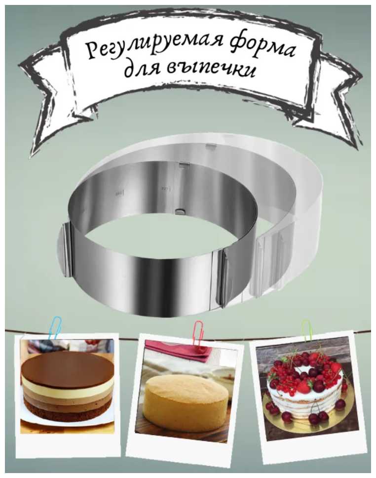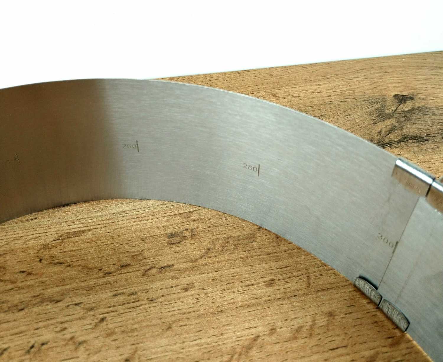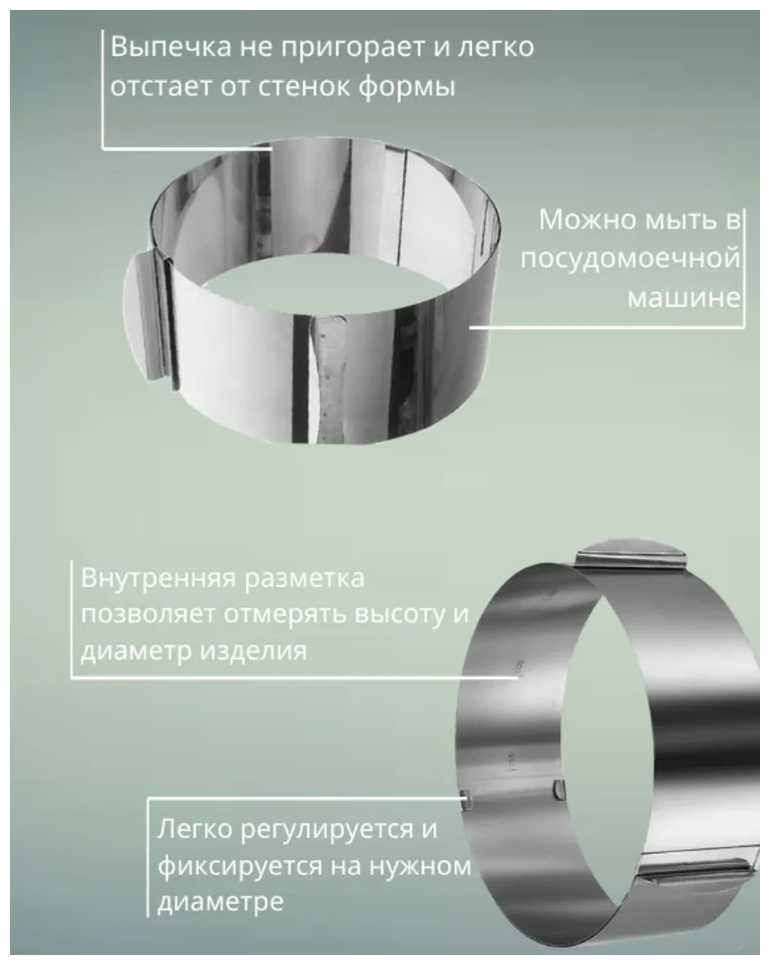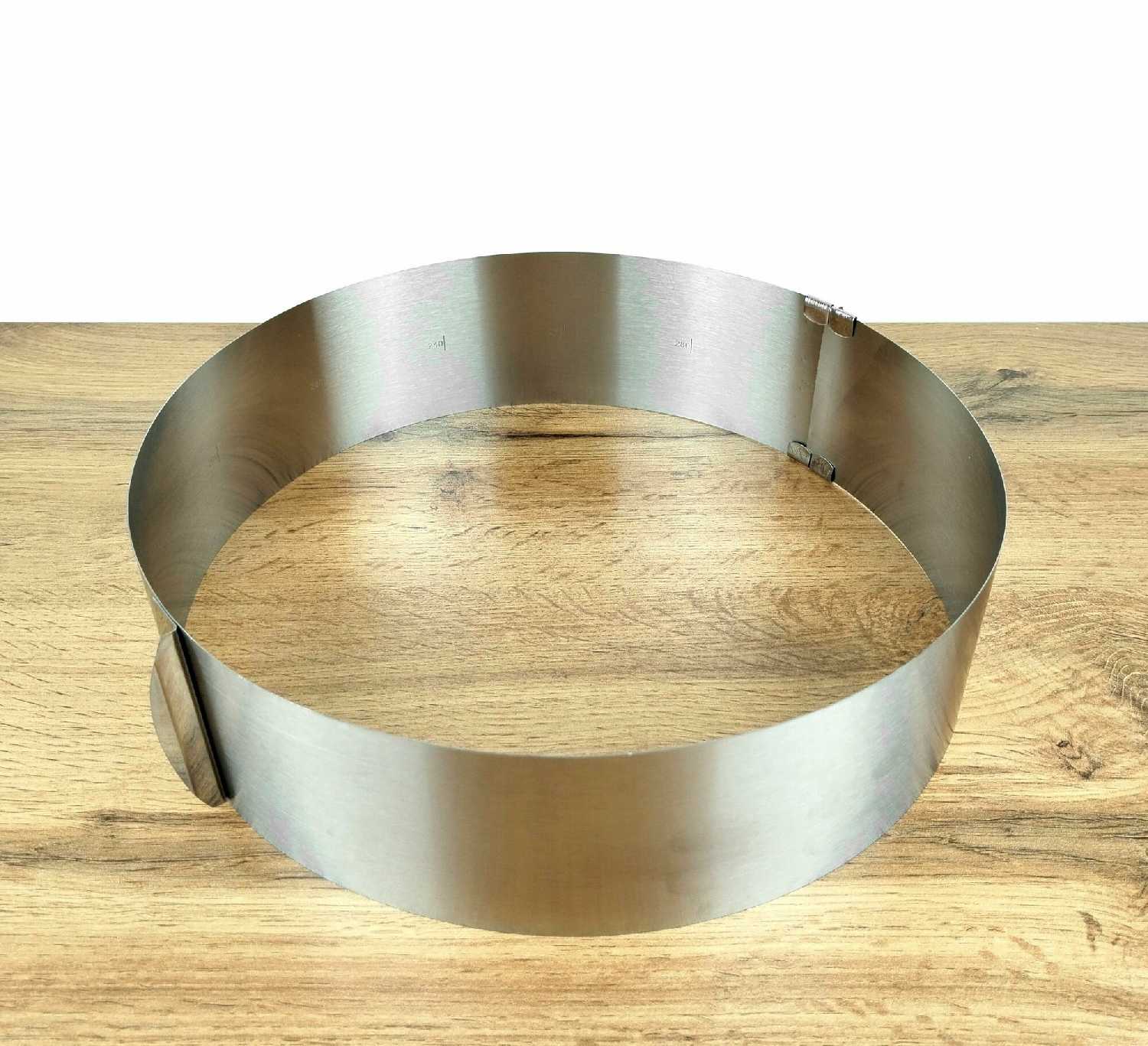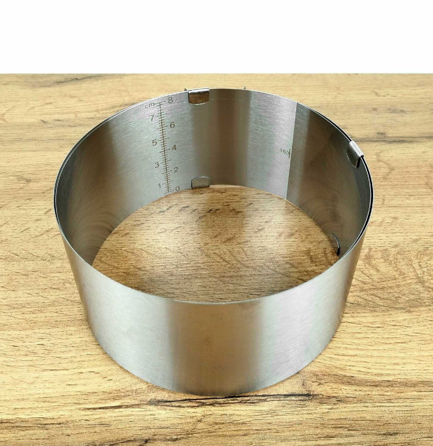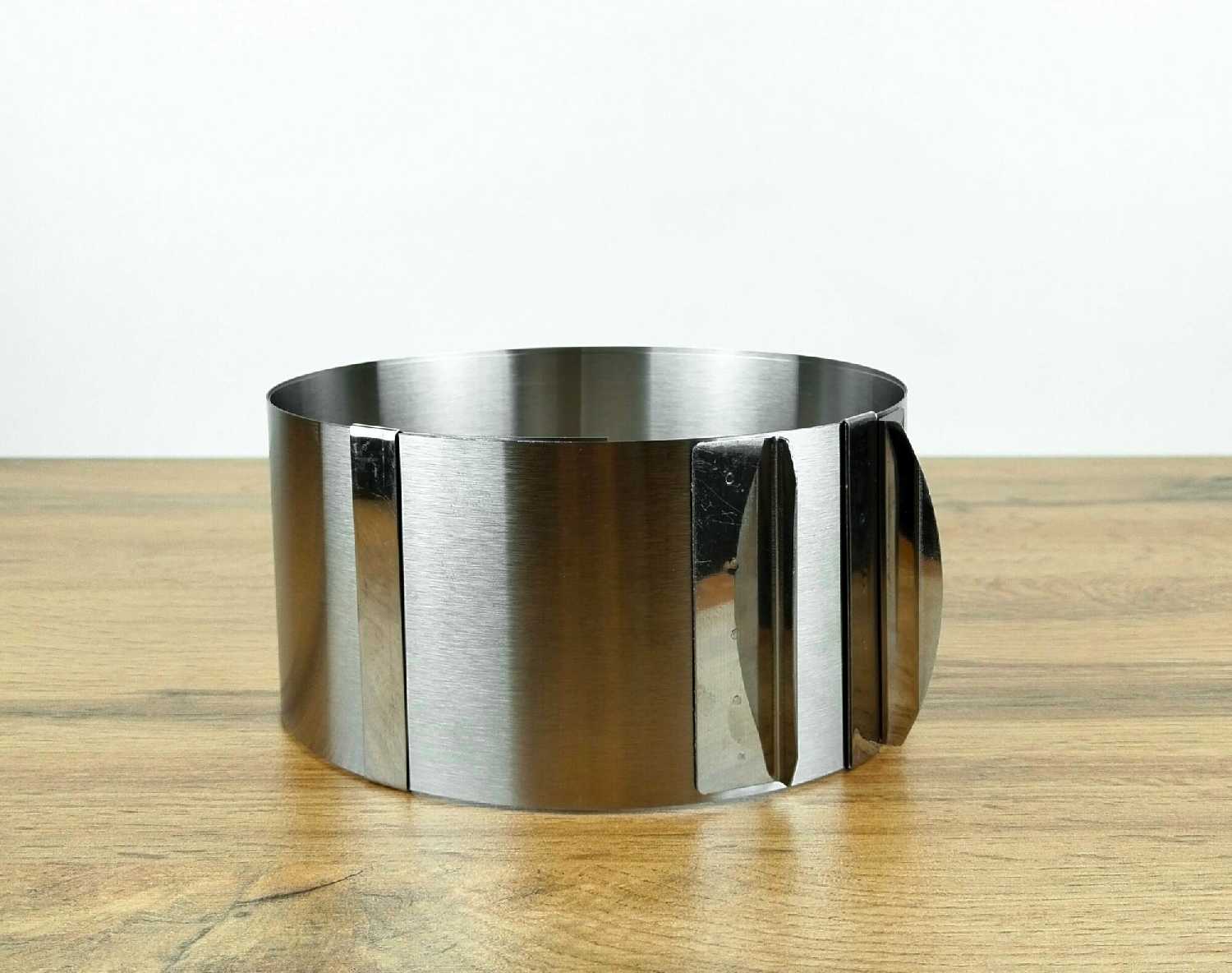 - Плавная настройка от 16 до 30 см позволяет заменить несколько форм одним кольцом, адаптируясь под любой объем теста или размер салата.