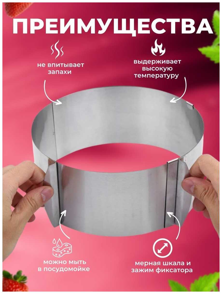 Эргономика и удобство эксплуатацииПродукт компактен в хранении — в собранном состоянии занимает минимум места, что актуально для небольших кухонь. Механизм трансформации интуитивно понятен: кольцо раздвигается руками без дополнительных инструментов, а фиксаторы (при исправности) надёжно удерживают заданный размер. Для мытья достаточно обычной губки, но острые края требуют осторожности. Конструкция подходит только для густых масс: при выпечке жидкого теста или работе с муссами возможны протечки. Отдельно упоминается удобство демонтажа — после приготовления кольцо легко снимается с блюда без деформации слоёв. Однако отсутствие ручек или выступов усложняет перенос заполненной формы, особенно при большом диаметре.