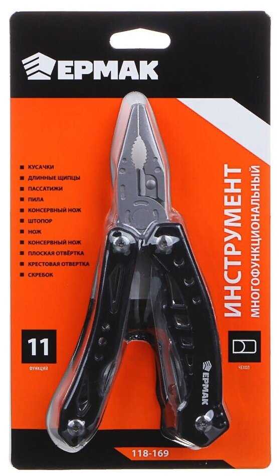 7.1/10 балловЕРМАК Многофункциональный инструмент ермак, 11 функций, нержавеющая сталь / Мультитул универсальный 118-169 / Нож складной, пассатижи, отвертка