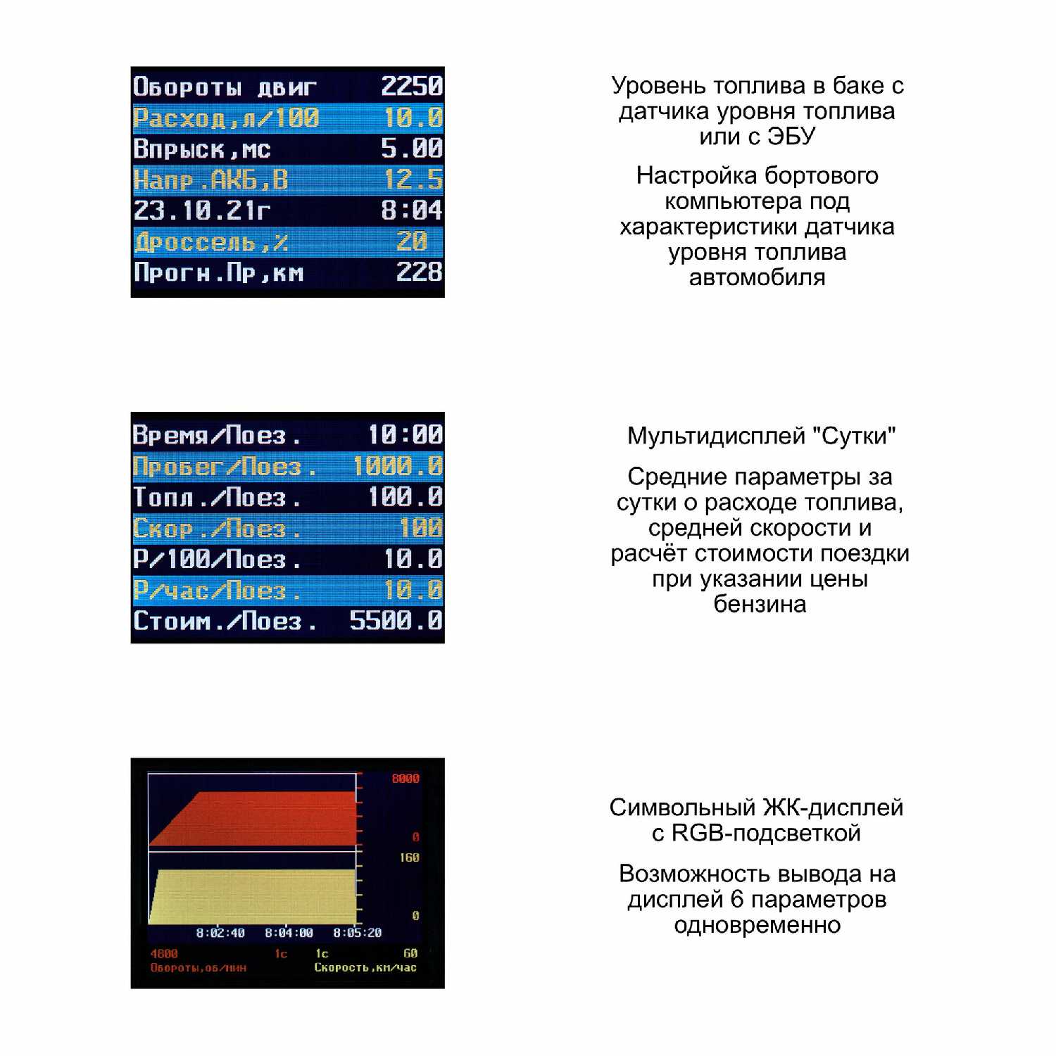 Дополнительная информация : | Основные особенности маршрутного компьютера Comfort X115: 1. RGB дисплей произвольного цвета. 2. 6 параметров на дисплее одновременно. 3. 4 программируемых мультидисплея пользователя. 4. Режим сушки свечей "Горячий запуск". 5. Автоматическая установка протокола. 6. Смена 6-и параметров одним касанием. 7. Коррекция температуры включения вентилятора. 8. Уровень топлива в баке с датчика уровня топлива или с ЭБУ. 9. Мультидисплей "Сутки" с расчетом стоимости поездки. |