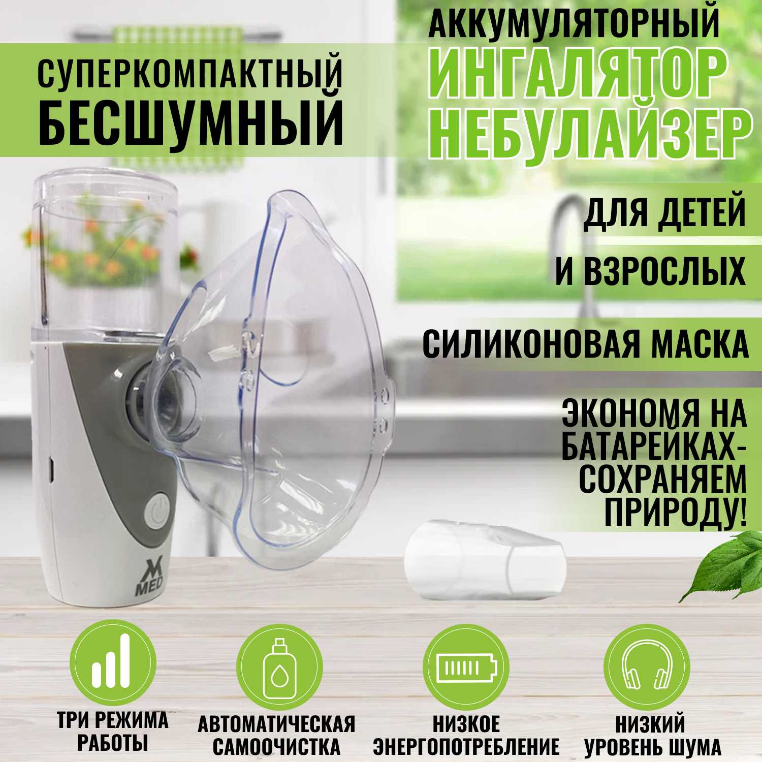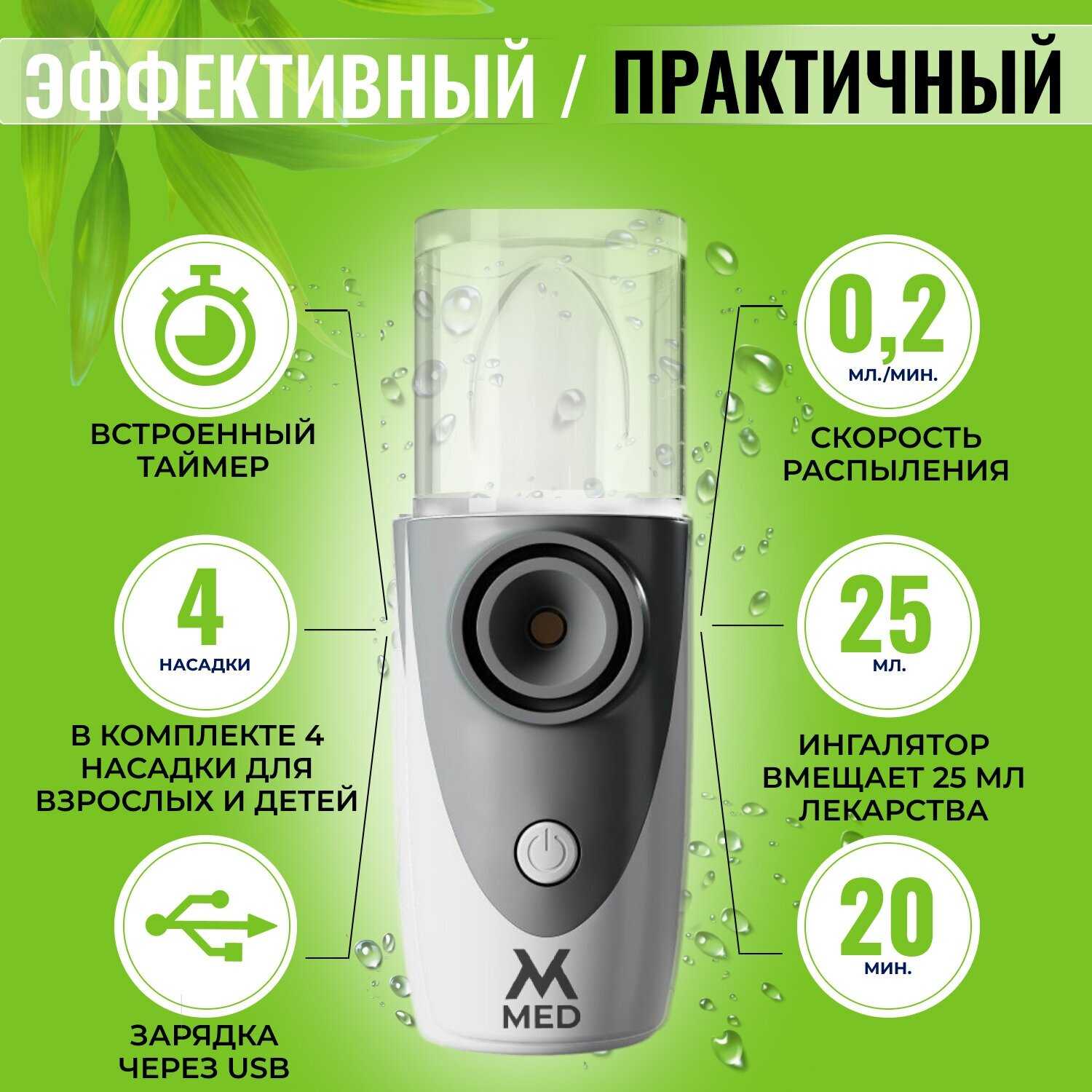 Взяла как дорожный вариант (в самолет/машину/поезд) для ребёнка. Тихий в работе, 3 скорости распыления, есть режим самоочистки, маски силиконовые (не пластик). Заряд от сети или пауэрбанк.