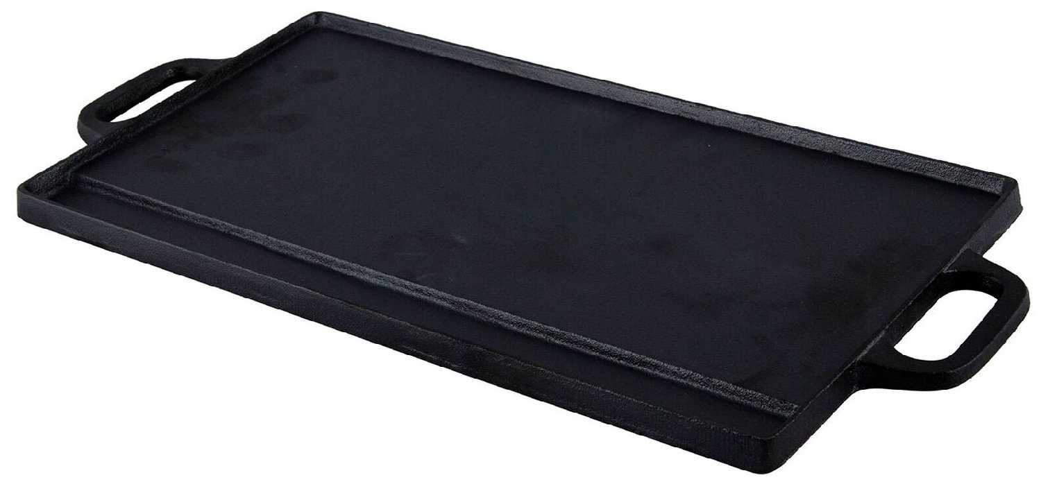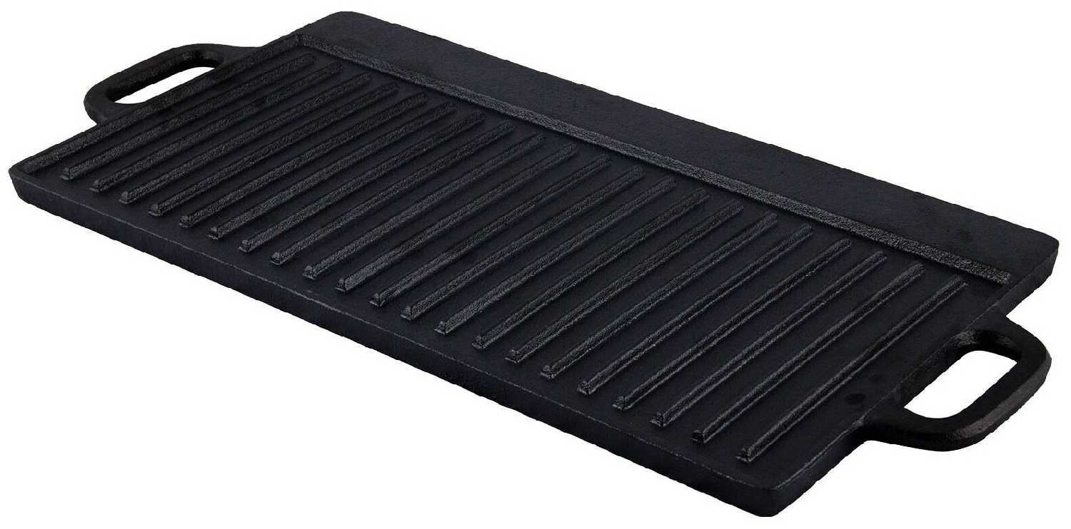 - + толстый чугун, с одной стороны ровная как сковорода, с другой рифлёная как гриль.