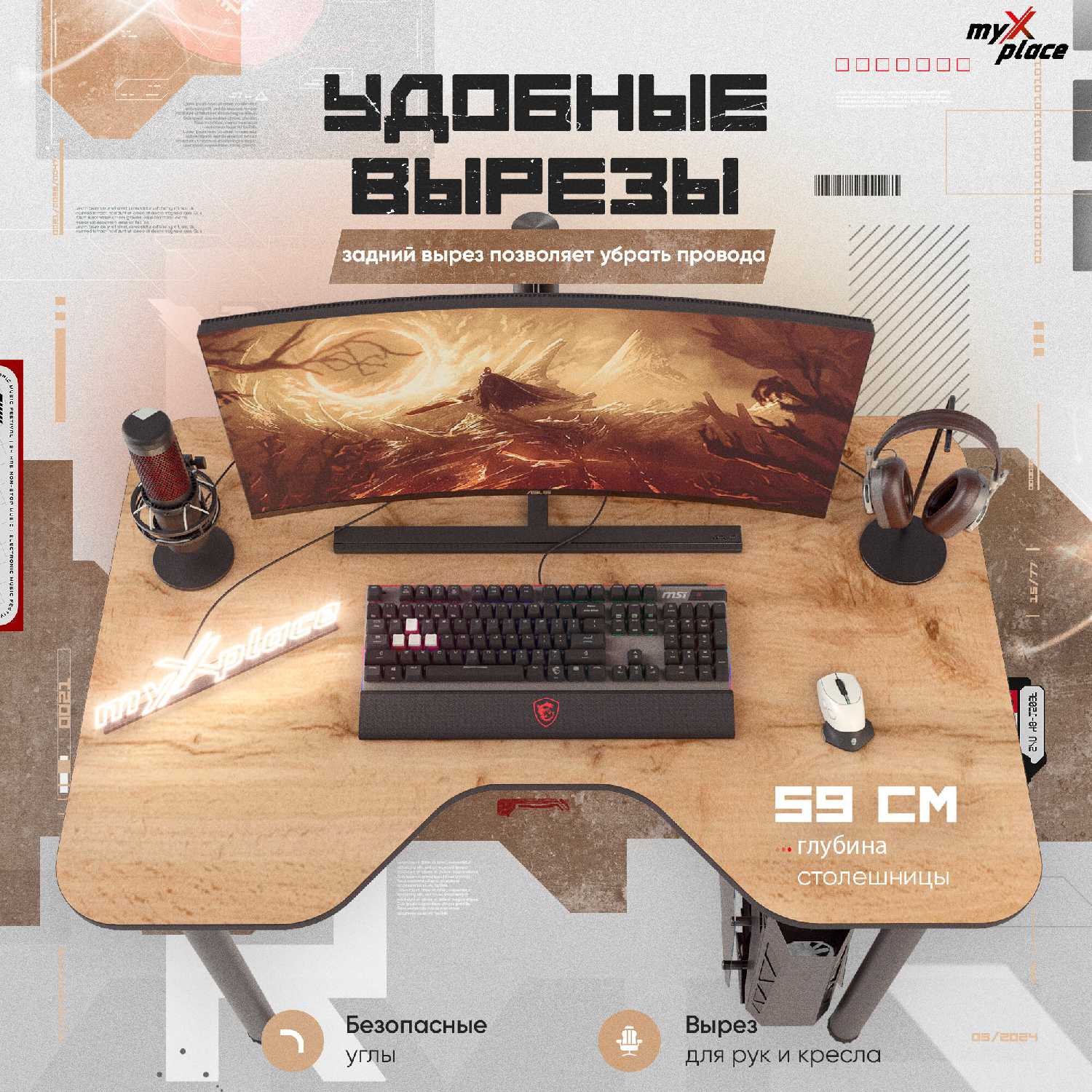 Эргономичный вырез глубиной 10-15 см (по визуальным оценкам пользователей) позволяет комфортно расположить локти, снижая нагрузку на плечи. Однако людям выше 185 см следует учесть: при близком расположении к монитору возможен дискомфорт из-за упора коленей в поперечную планку. Для стандартной посадки выемка признана оптимальной. -