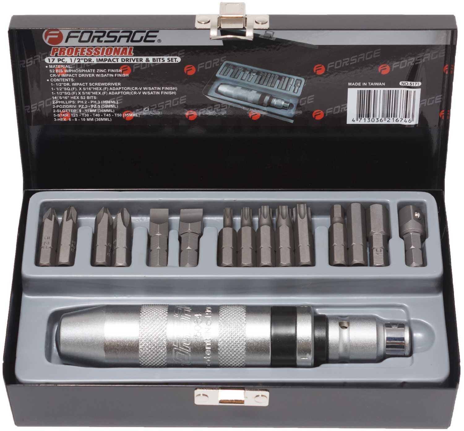 Forsage Отвертка ударная с набором бит и адаптером (14пр.1/2'(F)х5/16'(F))