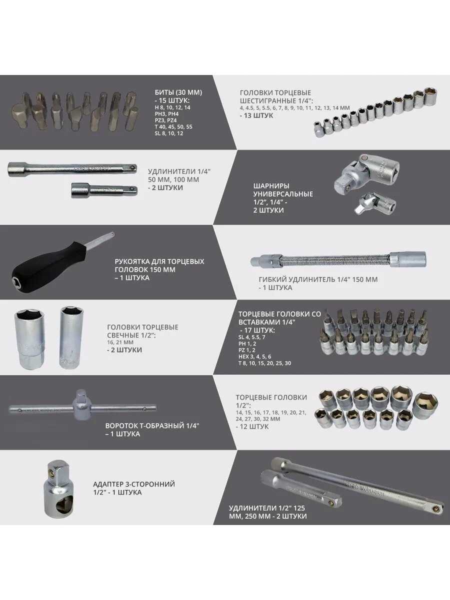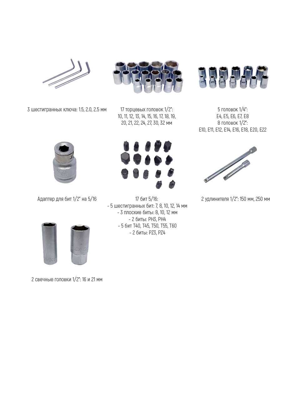 Характеристики:- Инструменты в комплекте: вороток для головок