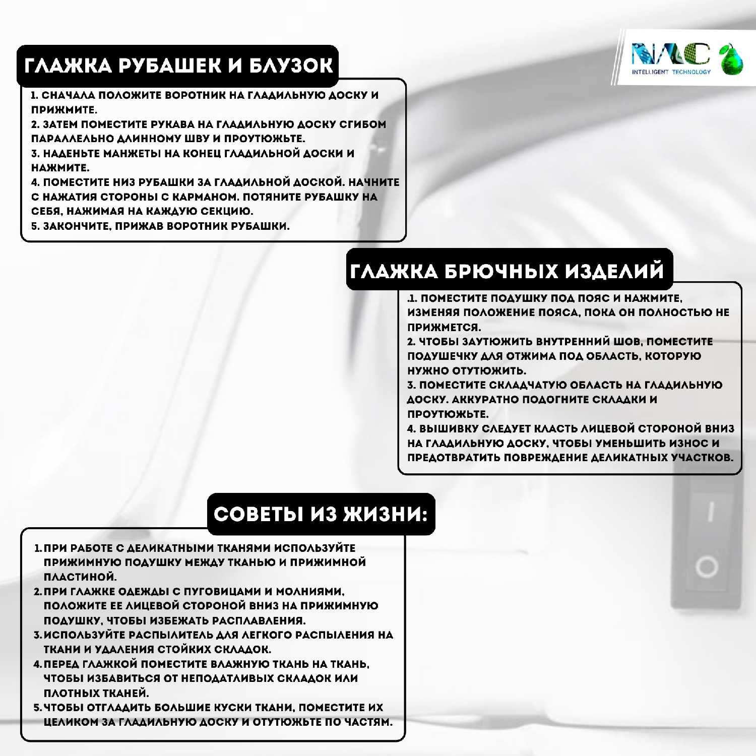| Особенности конструкции : | индикация готовности к работе, регулировка высоты доски, складная конструкция, съемный резервуар для воды, тефлоновая насадка, фильтр для воды |