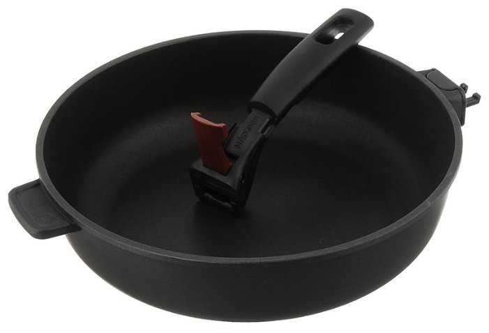 Отличная вместительная сковорода. При своих размерах можно компактно хранить за счёт съёмной ручки. Очень качественное стойкое антипригарное покрытие- не содержит вредных компонентов, при этом можно пользоваться металлической лопаткой.
