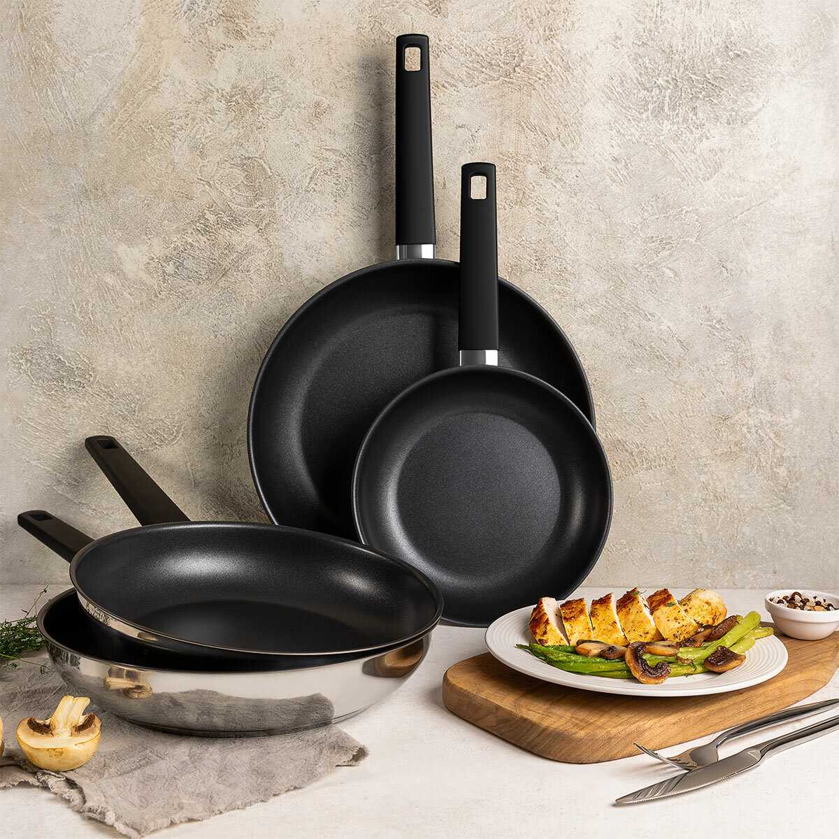 Сковорода идеальна для тех, кто ценит эстетику и готовит на индукционных плитах — полный индукционный диск исключает проблемы с нагревом. Компактные модели (20–26 см) подходят для приготовления завтраков, яичницы и порционных блюд, а версии на 28 см справляются с жаркой мяса или овощей на семью. Благодаря крышке в комплекте её можно использовать для тушения. Однако для интенсивной ежедневной эксплуатации или высокотемпературной готовки она не подходит — тонкие стенки и риск повреждения покрытия делают её скорее «дежурным» вариантом. Владельцы классических газовых плит выбирают её за стиль и лёгкость, но отмечают, что для профессиональной кухни лучше предпочесть модели с толстым многослойным дном.