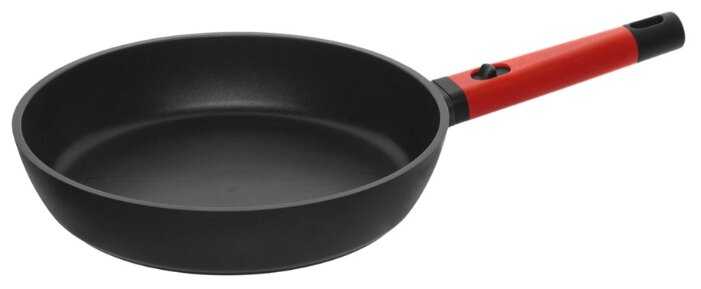 - + Съемная ручка, антипригарное покрытие - готовлю без масла, и ничего не пригорает. Нравится цвет ручки) очень стильное сочетание черного и красного!