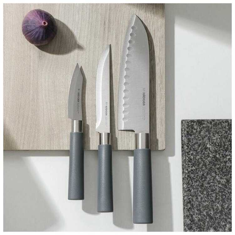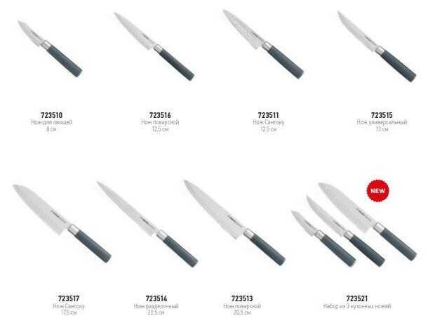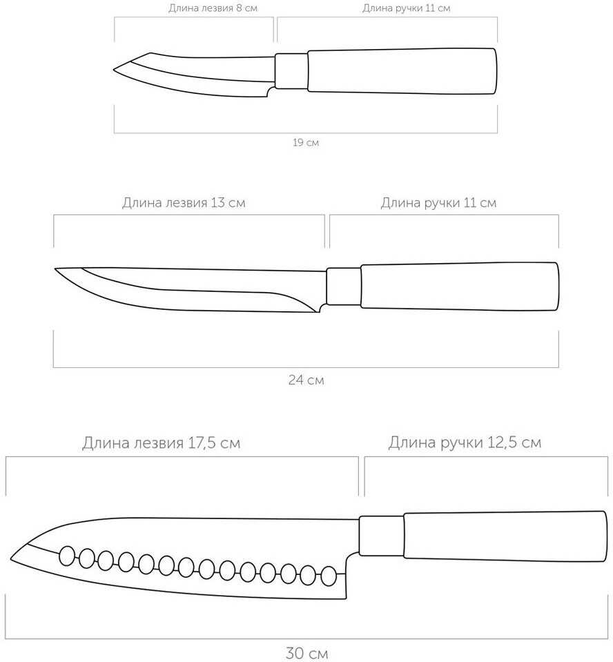 | Подробная комплектация : | нож Сантоку с углублениями - 17, 5 см (общая длина 30 см), универсальный - 13 см (общая длина 24 см), нож для овощей - 8 см (общая длина 19 см) |