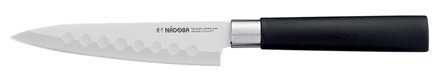 "Маленький шеф", как хочется его назвать - хорошая бюджетная модель. Форма маленького шефа, центровка (ЦТ находится под указательным пальцем режущего), прямая рукоять из твердого шершавого пластика, антиадгезионные выемки на лезвии. Ножи этой фирмы мне вообще нравятся.