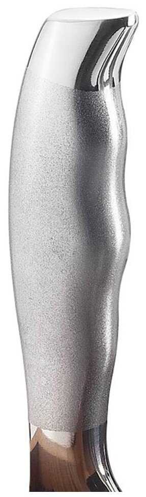 - Сталь 50CrMoV15 с твердостью 56-58 HRC обеспечивает износостойкость: лезвие не деформируется при нарезке твердых продуктов (например, замороженного мяса).