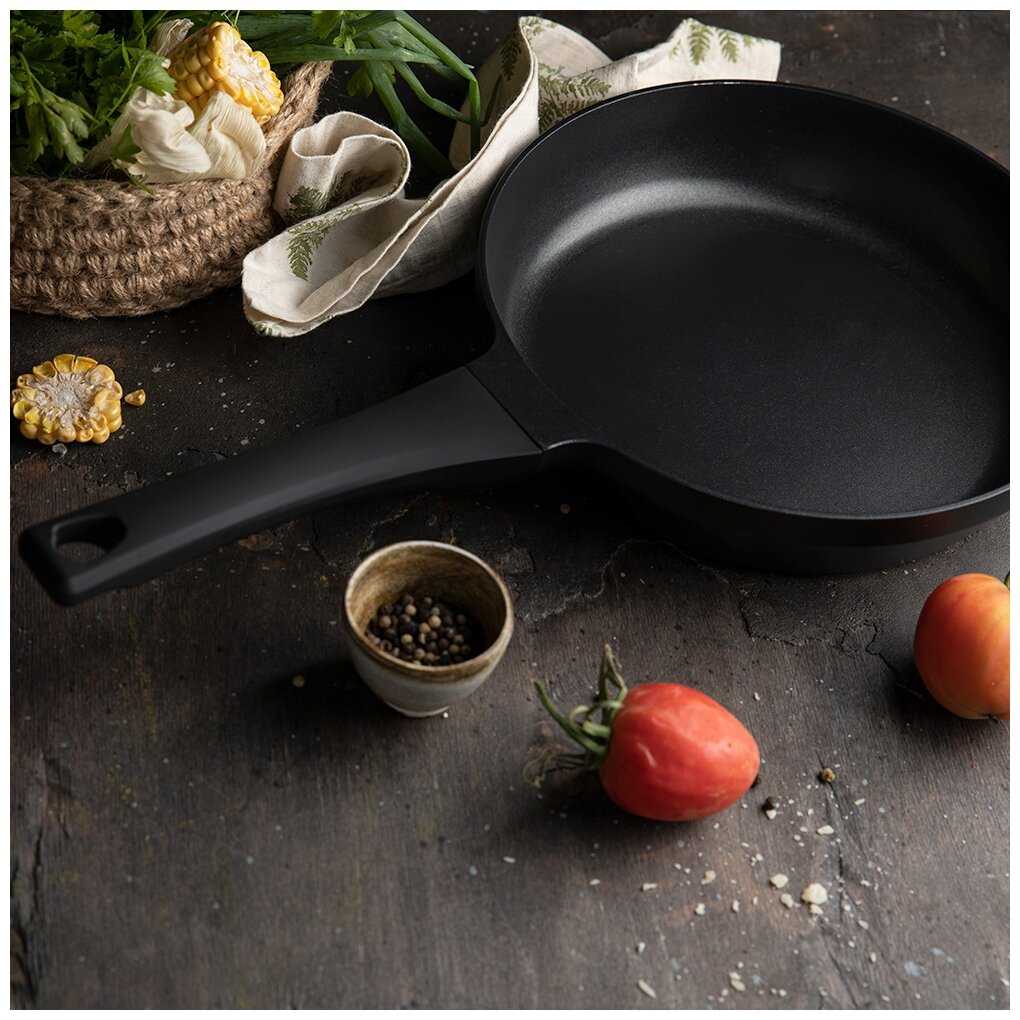 Хорошее антипригарное покрытие у сковороды. во-первых, к нему пища не прилипает, не подгорает. Омлет целым кругляшом буквально соскальзывает в тарелку. Мыть потом сковороду заметно проще. Во-вторых, покрытие прочное. Никаких царапин и сколов на нем не появляется, а сковороду я использую довольно часто. Дно толстое у сковороды и нагревается равномерно. При жарке котлет, рыбы, бифштексов я их не передвигаю по всей сковороде в поисках более нагретого места. Нет, все дно одинаково нагретое. Ручка при готовке не нагревается. в любой момент можно за нее взяться без прихватки.