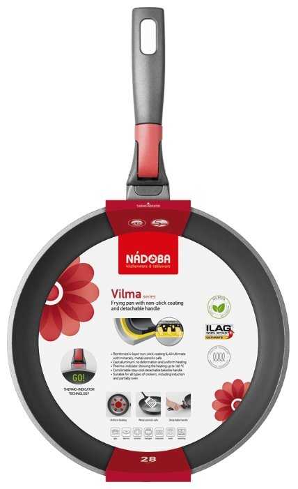 - + Очень удобная сковородка от Nadoba со съемной ручкой механизм съема ручки удобный и надежный, сковородку можно использовать в духовке . Данная сковорода с самым лучшим антипригарным покрытием, ILAG Ultimate производство Швейцария, которое использует Nadoba. Высокая прочность антипригарного покрытия позволяет использовать в работе с посудой неострые металлические инструменты.