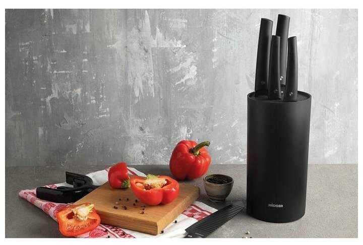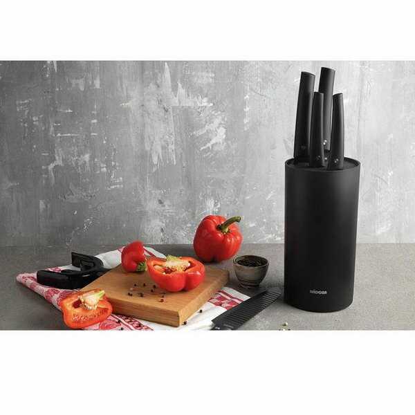 - нож для овощей 9 см, - нож универсальный 125 см, - нож сантоку 175 см, - нож разделочный 20 см, - нож поварской 20 см, - универсальный блок для ножей |
