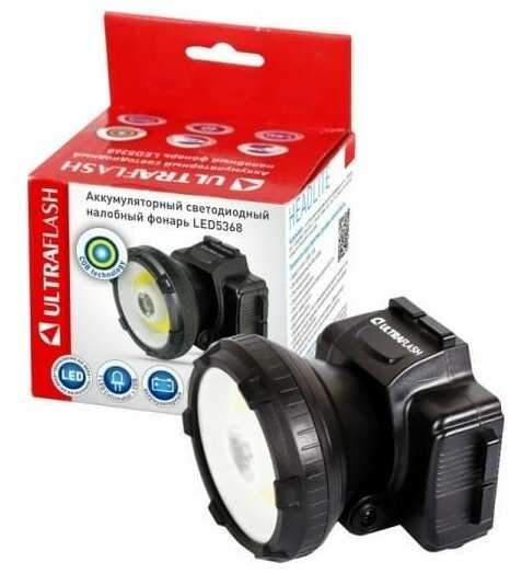 Ultraflash LED5368 (фонарь налобн аккум 220В, черный, 1 Ватт LED+1,5Ватт COB, 2 реж, пл, бокс)