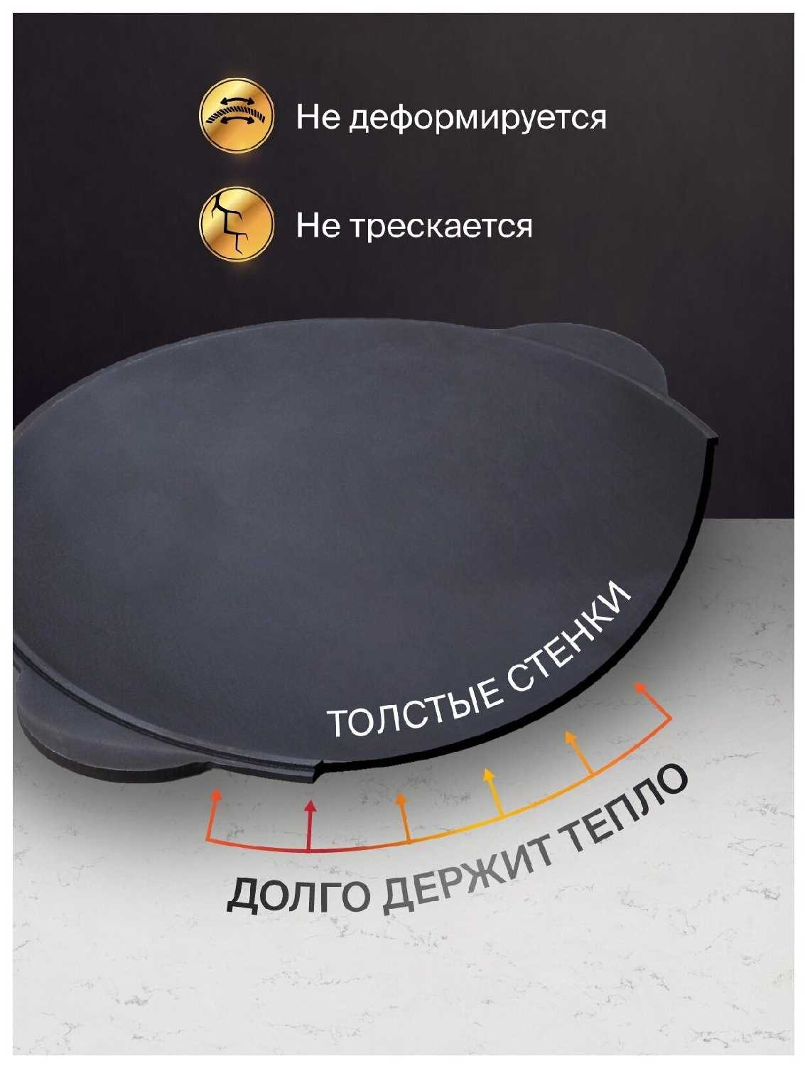 - Толстостенный чугун (8–10 мм) обеспечивает равномерный нагрев и долгое удержание тепла: