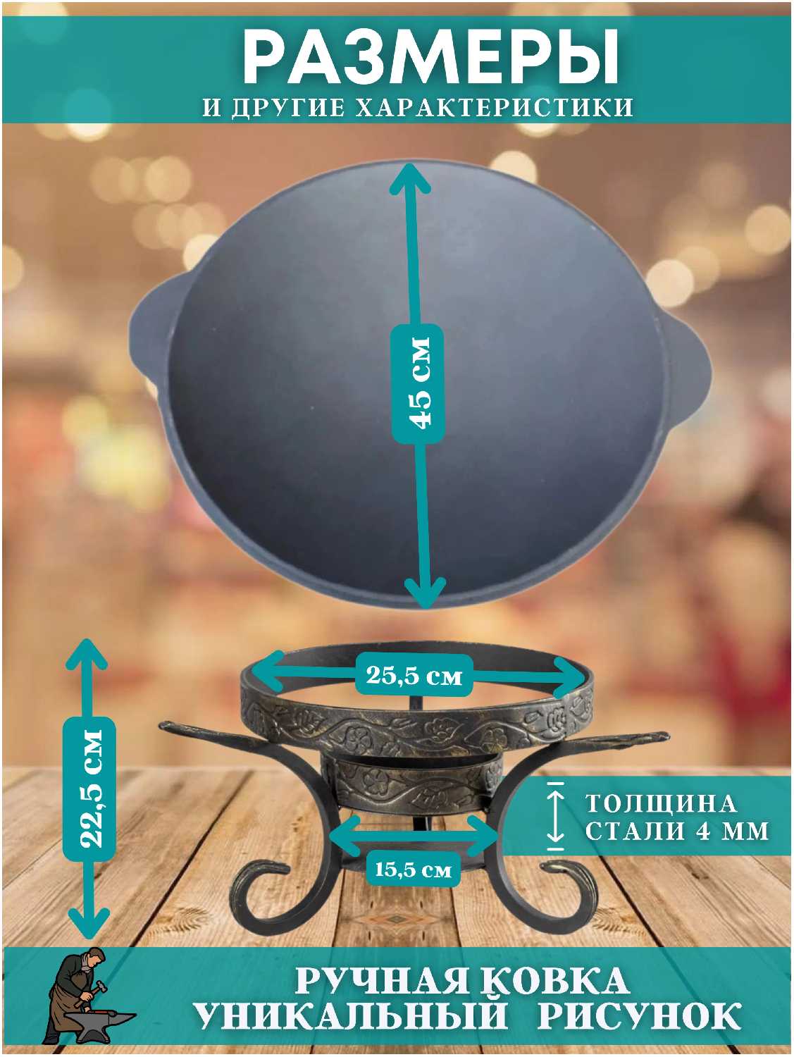 | Дополнительная информация : | размер подставки: высота 155 см диаметр верхнего кольца 255 см диаметр нижнего кольца (под угли) 155 см толщина стали 4 мм каждая подставка скованна вручную рисунок может отличаться от представленного на фото, рекомендации: храните в сухом месте не используйте моющие средства |