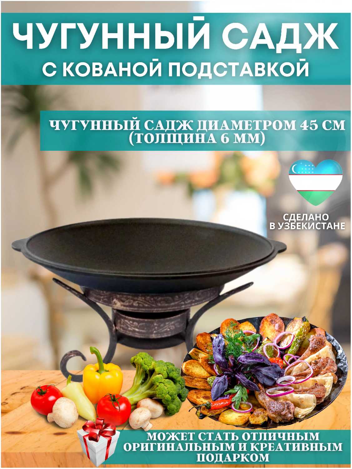 отличный садж,чугун,с подставкой ,туда можно посыпать углей и мясо или рыба с овощами всегда будут горячими!