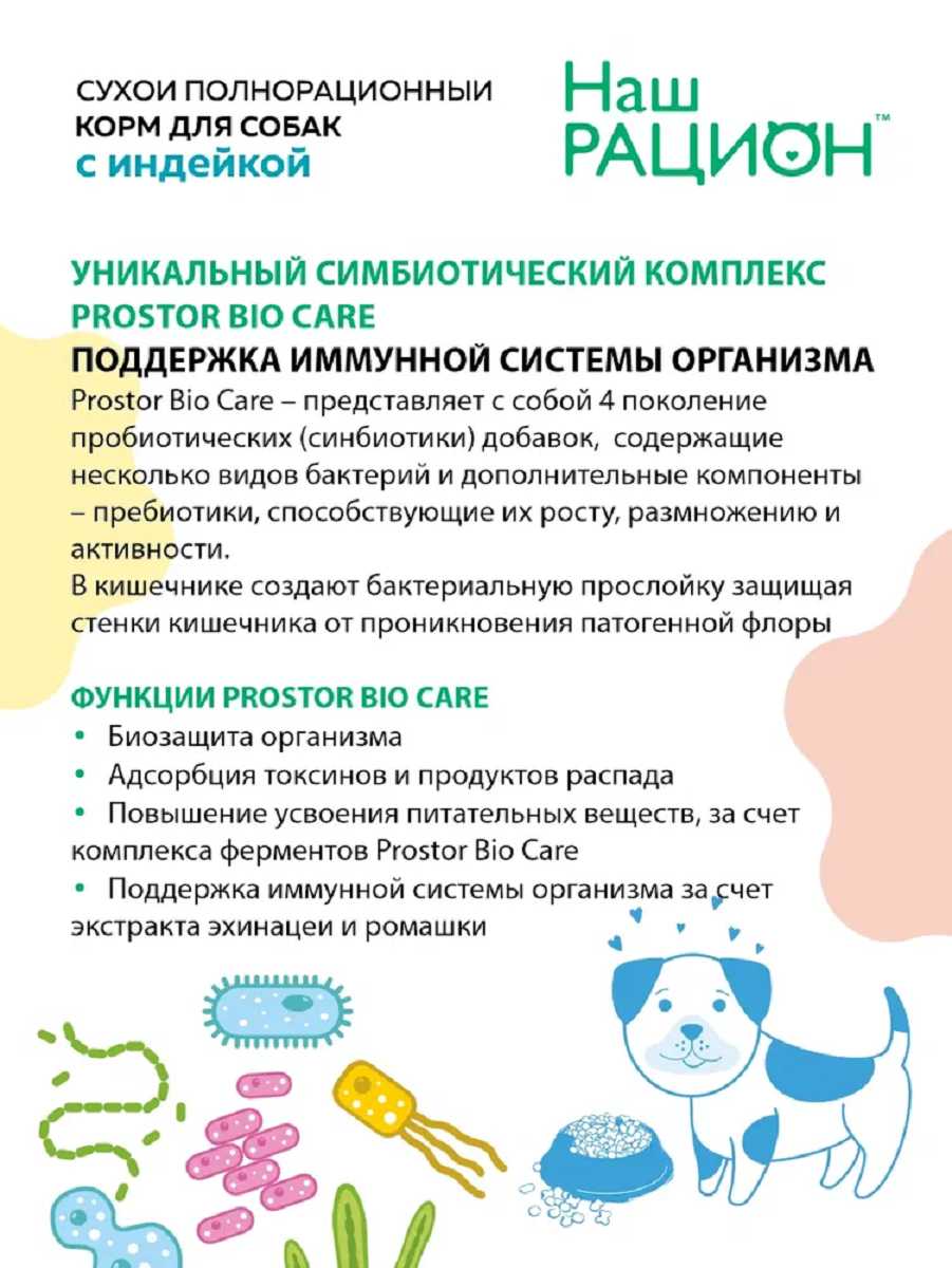 | Дополнительная информация : | суперфуд-комплекс: семена льна (источник Омега-3 жирных кислот лечение гастритов энтеритов язв желудка) пробиотики и пребиотики (добавка ProStor Bio Care поддерживает микрофлору кишечника) спирулина (природный источник йода и полисахаридов защита организма), подходит для собак с аллергией на высокопротеиновые корма |