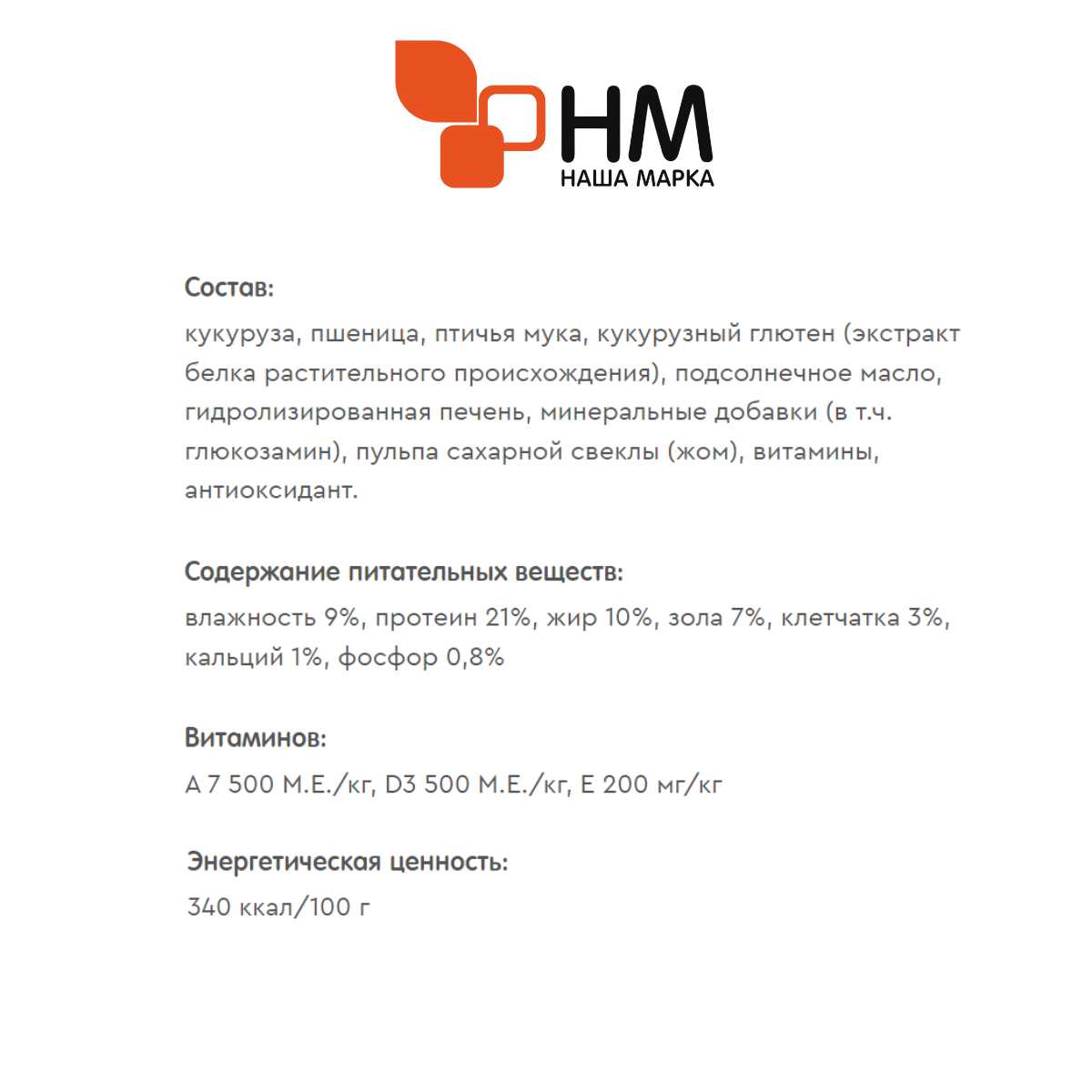 Перевел крупную охранную дворнягу с более дорогого тоже отечественного корма на Нашу Марку, пока что никаких недостатков про него написать не могу. В составе витамины есть, энергетическая ценность подходит для больших животных. Пес выглядит хорошо, насыщается быстро. Ну и экономия неплохая.